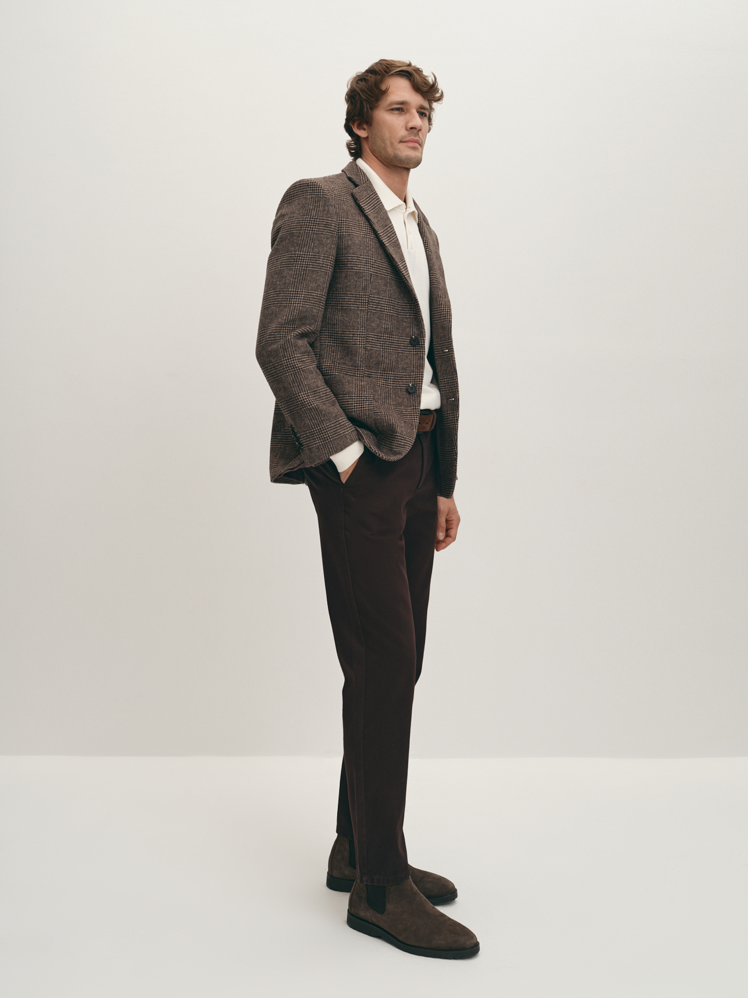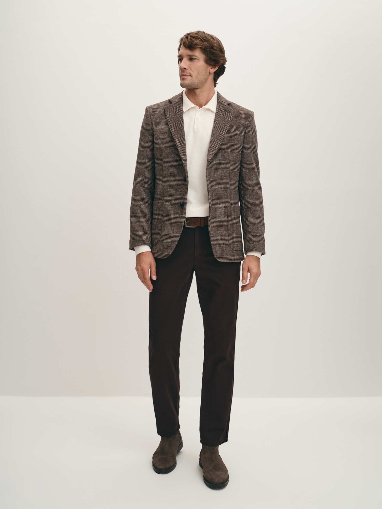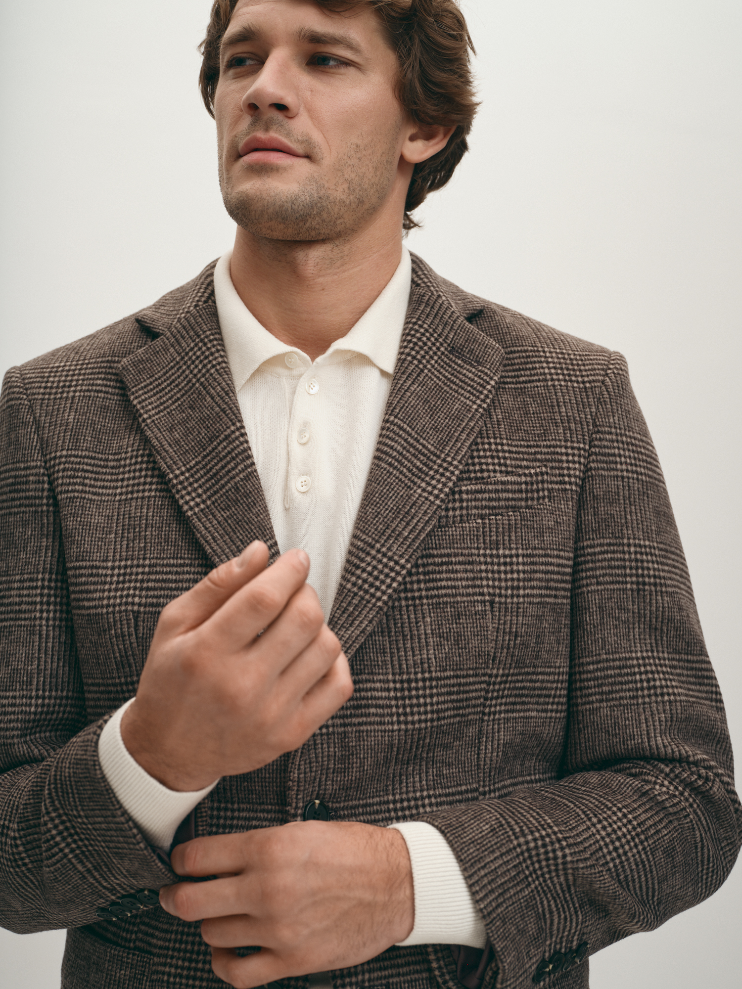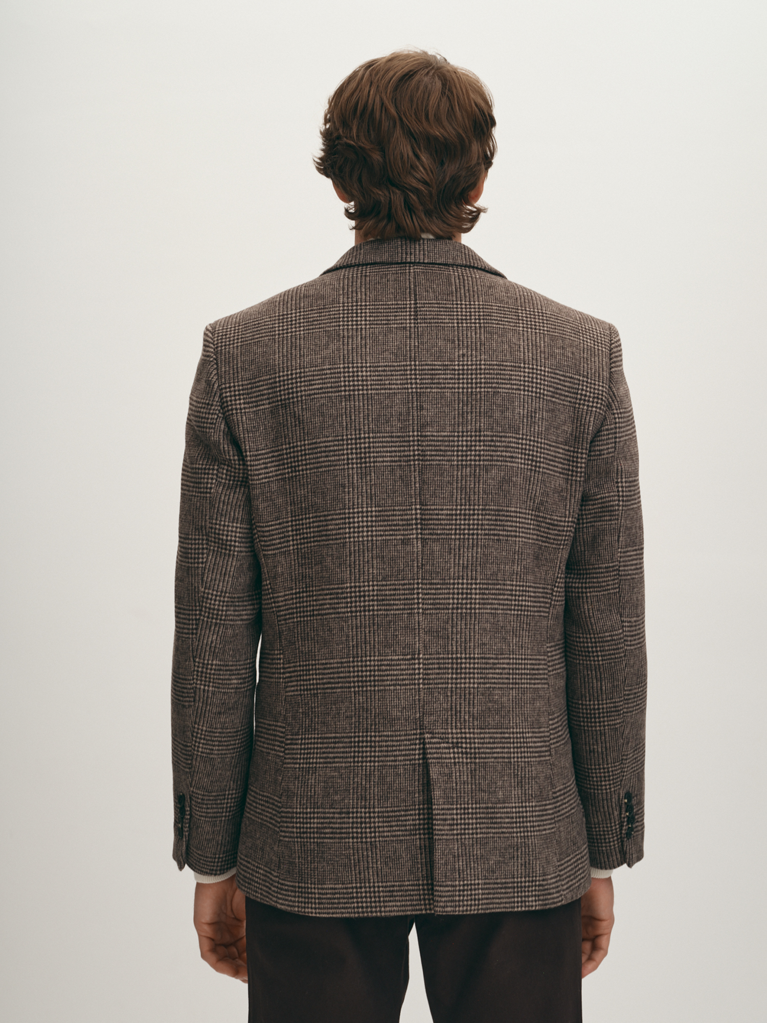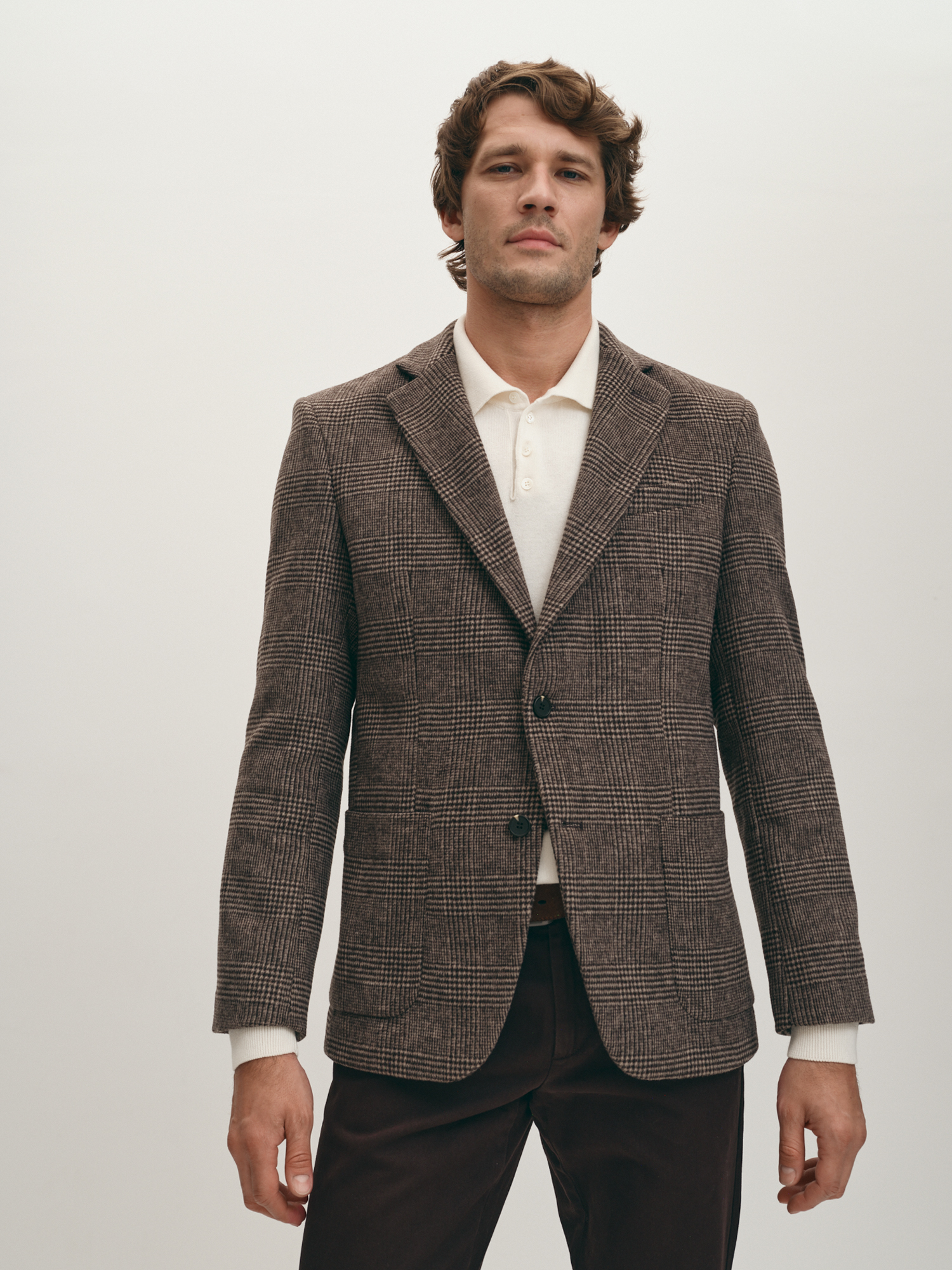 Пиджак кремово-коричневой расцветки в клетку станет отличным выбором для тех, кто ищет элегантную и удобную одежду.Овечья шерсть в составе будет прекрасно согревать и сохранять тепло в осеннее время года. Он идеально подойдет как для деловых образов, так и для образов в повседневном стиле.