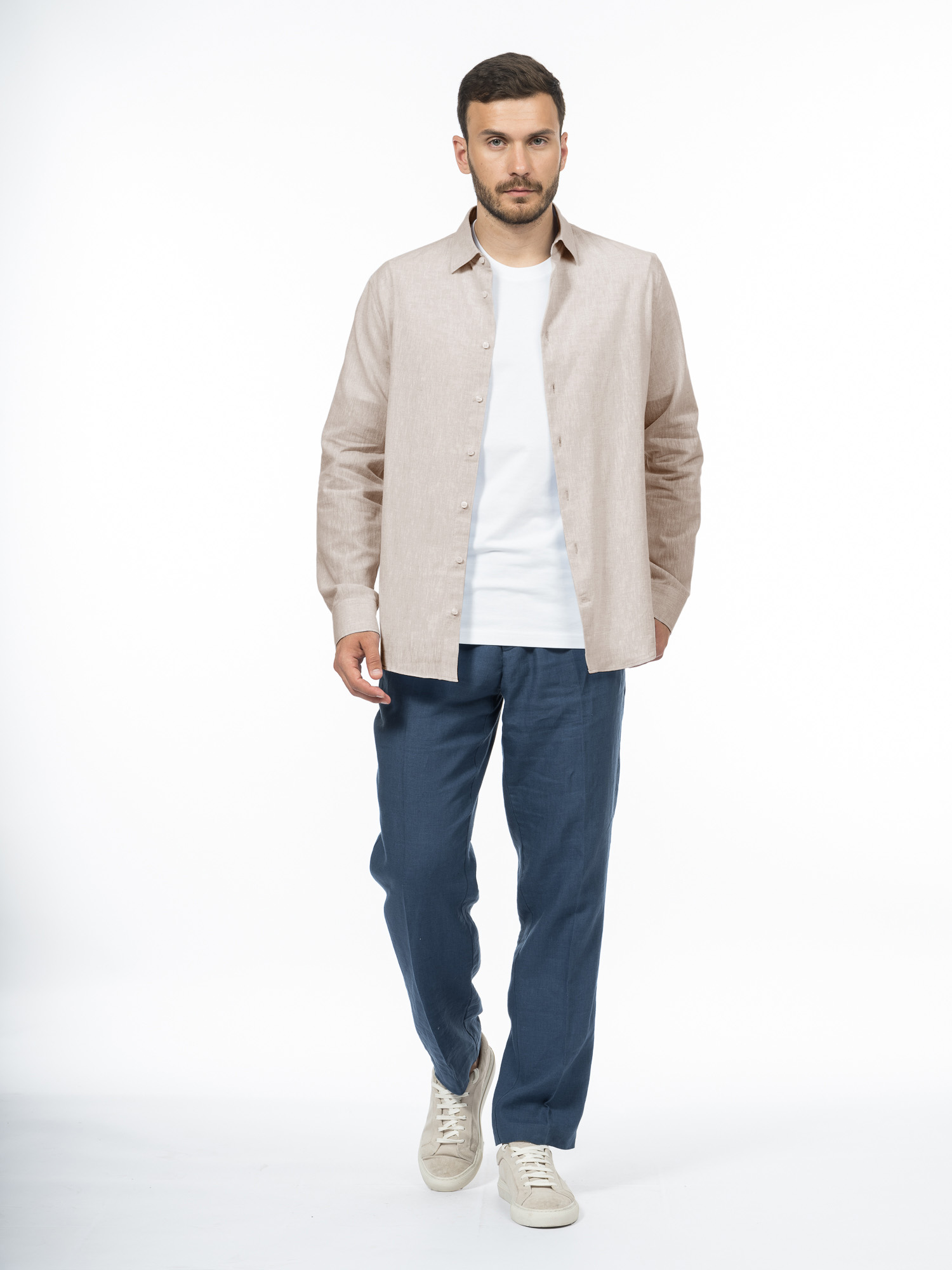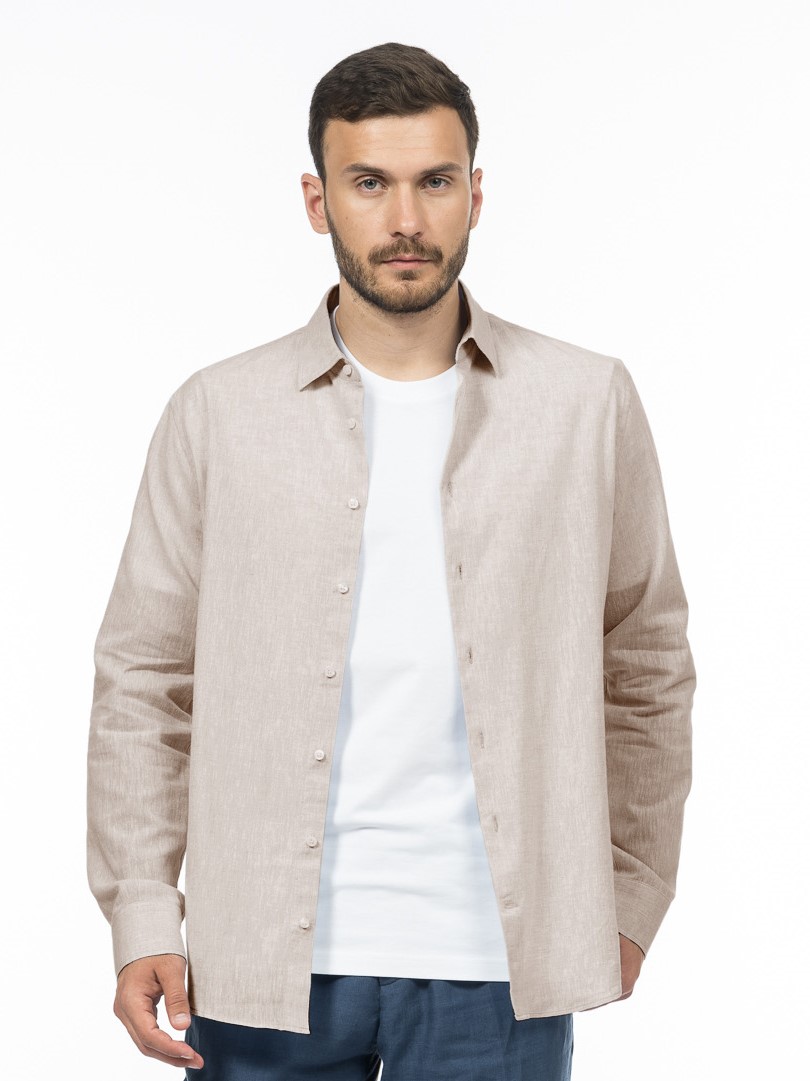 Модель лаконичного дизайна характеризуется традиционными для классической рубашки деталями. Прямой крой обеспечивает комфорт в движении и универсальность. Отложной воротник на отрезной стойке дисциплинирует образ и расширяет стилистические возможности, позволяя с легкостью трансформировать лук от офисного варианта до расслабленного городского образа просто расстегнув верхние пуговицы и закатав рукава. Узкая кокетка на спине обеспечивает правильную посадку по плечам. Закругленный низ не топорщится при заправке в брюки. Качественный дуэт хлопка и льна отвечает за комфорт: хлопок обеспечивает мягкость и гипоаллергенность, а лен добавляет благородную фактуру и уникальную способность к терморегуляции. Такая ткань создана для того, чтобы кожа дышала, оставаясь при этом сухой, несмотря на жаркую погоду. Выбрали для рубашки комфортного силуэта regular премиальную меланжевую ткань производства Турции. Меланжевый бежевый придает образу сложность без ярких акцентов. Идеален для мужчин с характером, ценящих сдержанность.Особая деталь - брендированная вышивка на манжете — тонкий акцент, выполненный на профессиональной вышивальной машине TAJIMA, который подчеркивает внимание к деталям и делает модель узнаваемой.