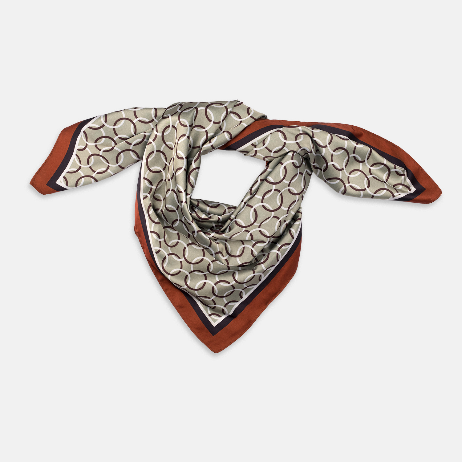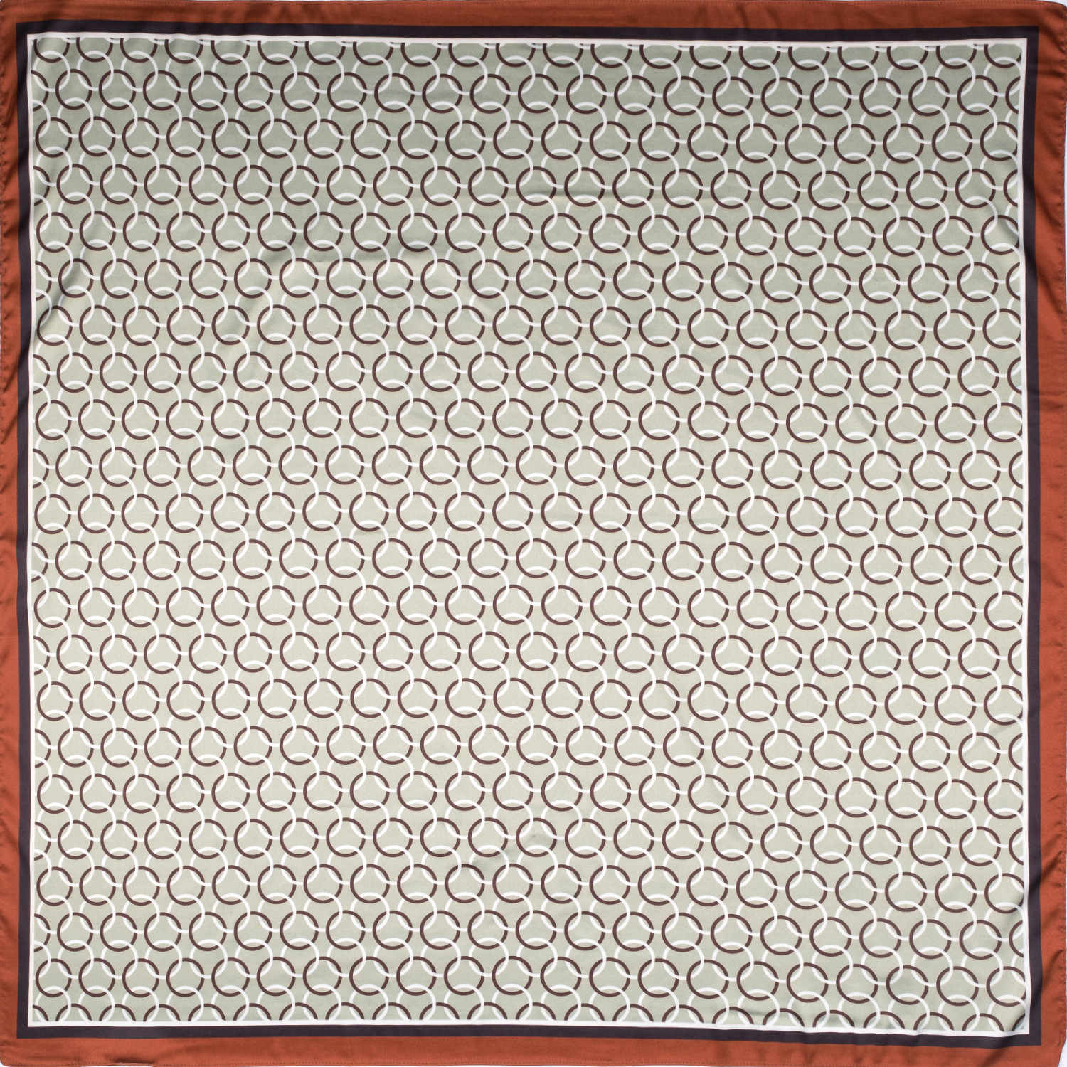 Объемный двусторонний платок - актуальный и универсальный аксессуар. Привлекает внимание рисунок в виде круглых звеньев, соединенных между собой, который по-разному смотрится на двух сторонах: на серо-бежевом фоне и голубом. Теперь легко изменить образ, просто перевернув платок. Сделанный из прочных поливолокон, он практичен в уходе — не мнется, сохраняет форму и яркость цветов после стирки.Такой универсальный аксессуар поможет завершить самые разные образы: добавит элегантности классическому пальто, подчеркнет романтичность летящего платья или подчеркнет талию в луке с классическим пиджаком, трикотажным платьем. Многофункциональным платок делает достаточно большой размер — его можно повязать как шарф, накинуть на плечи или использовать на сумке как ленту-твилли.