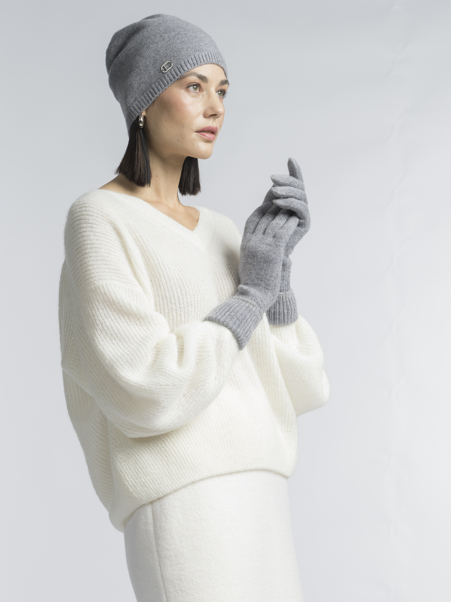 Стильный и очень теплый аксессуар, дополненный фирменным металлическим украшением, заставит Вас полюбить холодное время года. Носите шапку в оттенке серого меланжа с перчатками GL0044V из 100% кашемира.