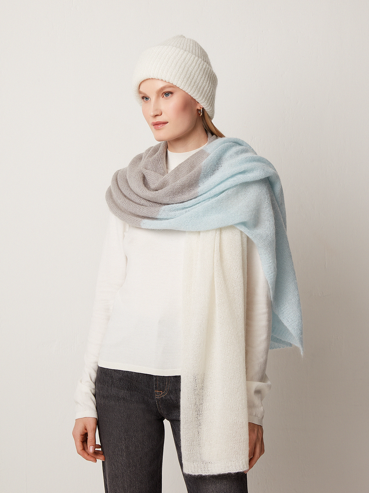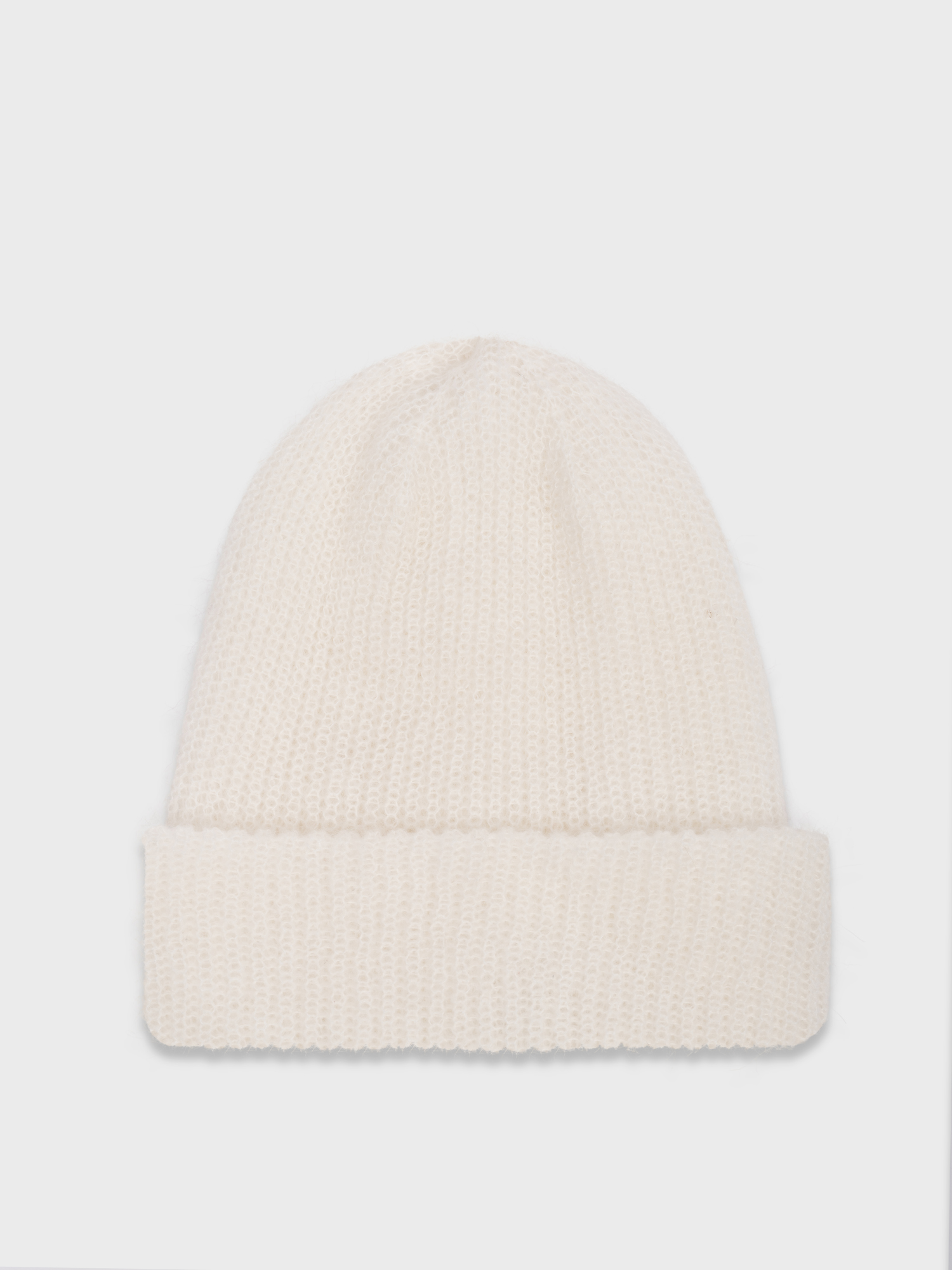 Трикотажная  шапка из тёплой миксовой пряжи на основе овечьей шерсти и мохера.  Модель белого оттенка, связанная гладкой вязкой, мягко облегает голову. Аксессуар хорошо сочетается с шарфом и перчатками из той же коллекции.