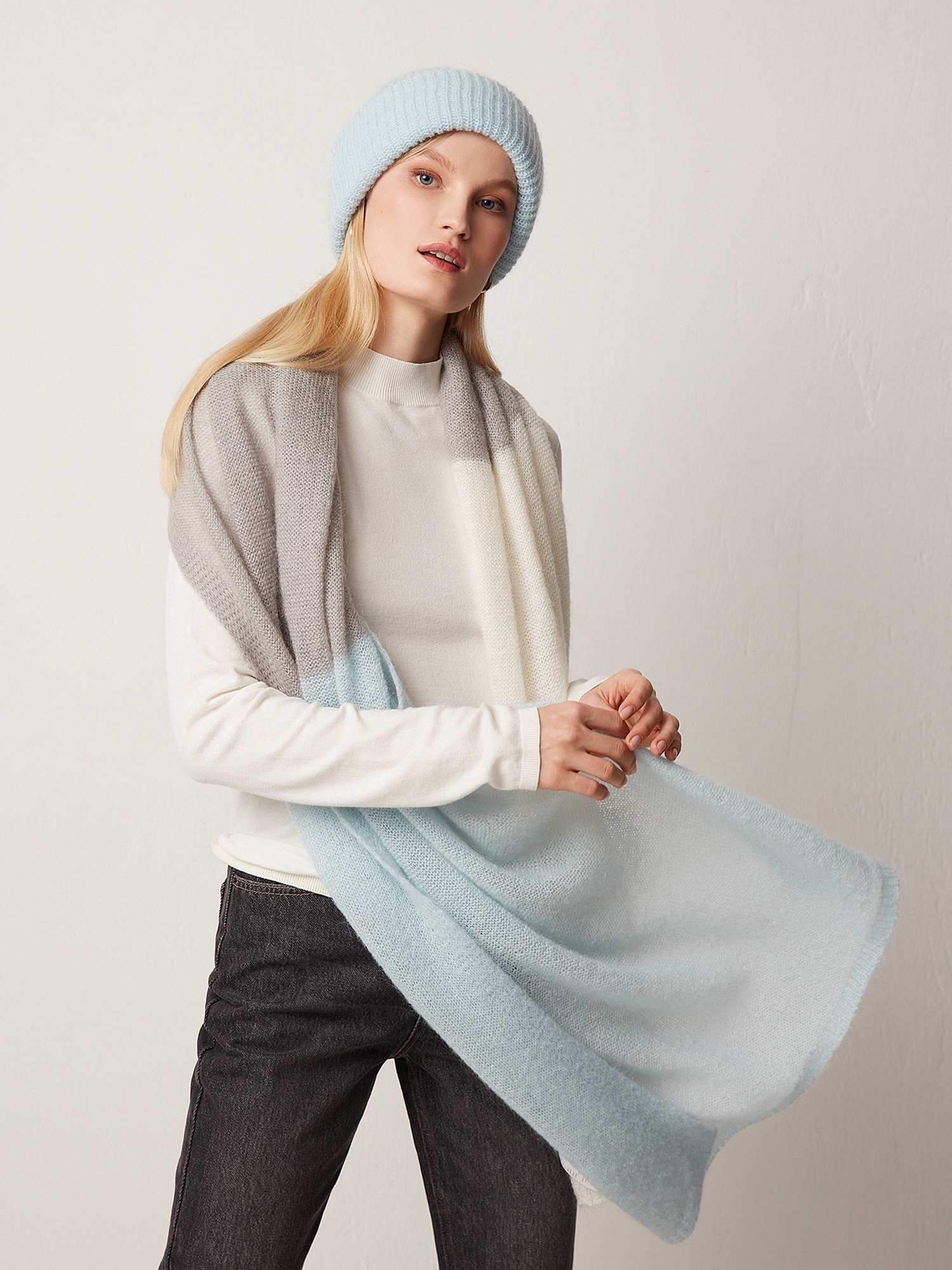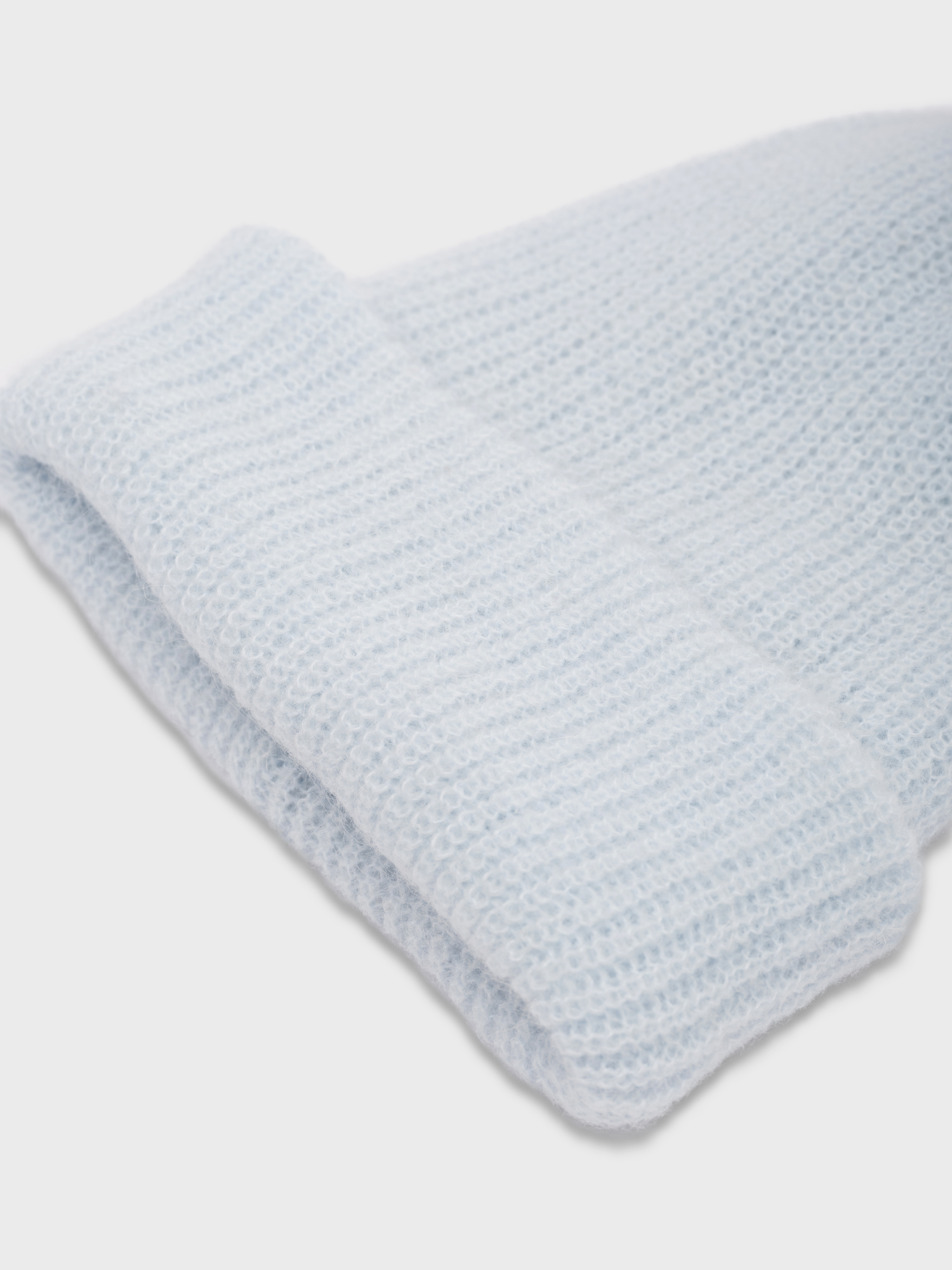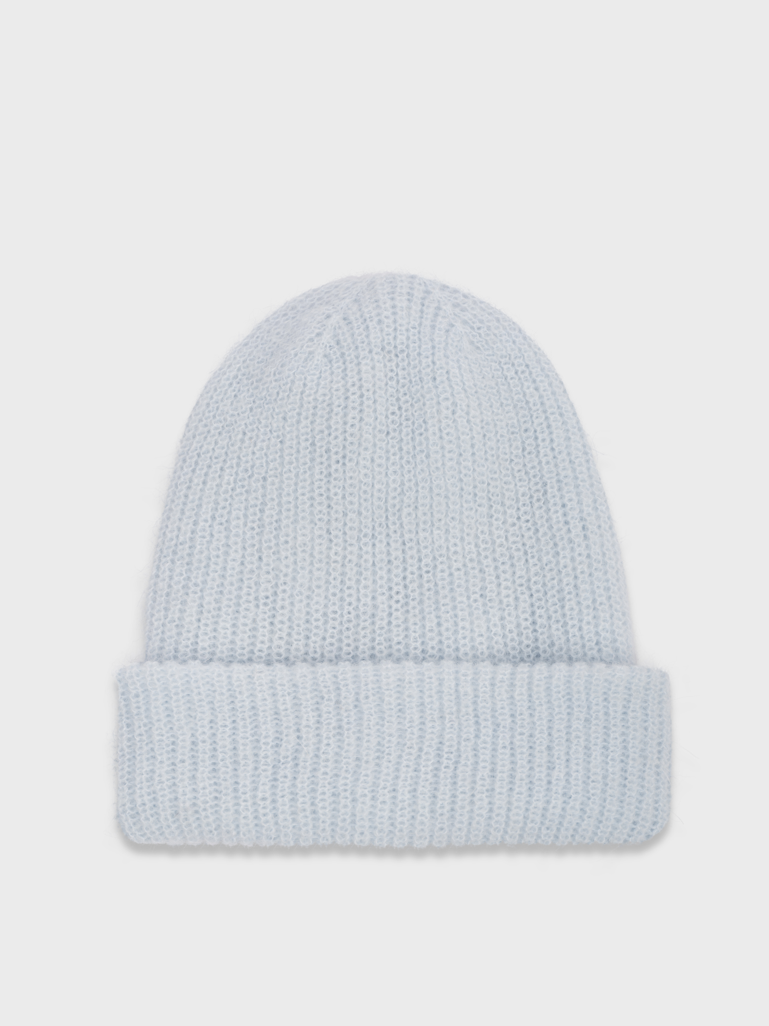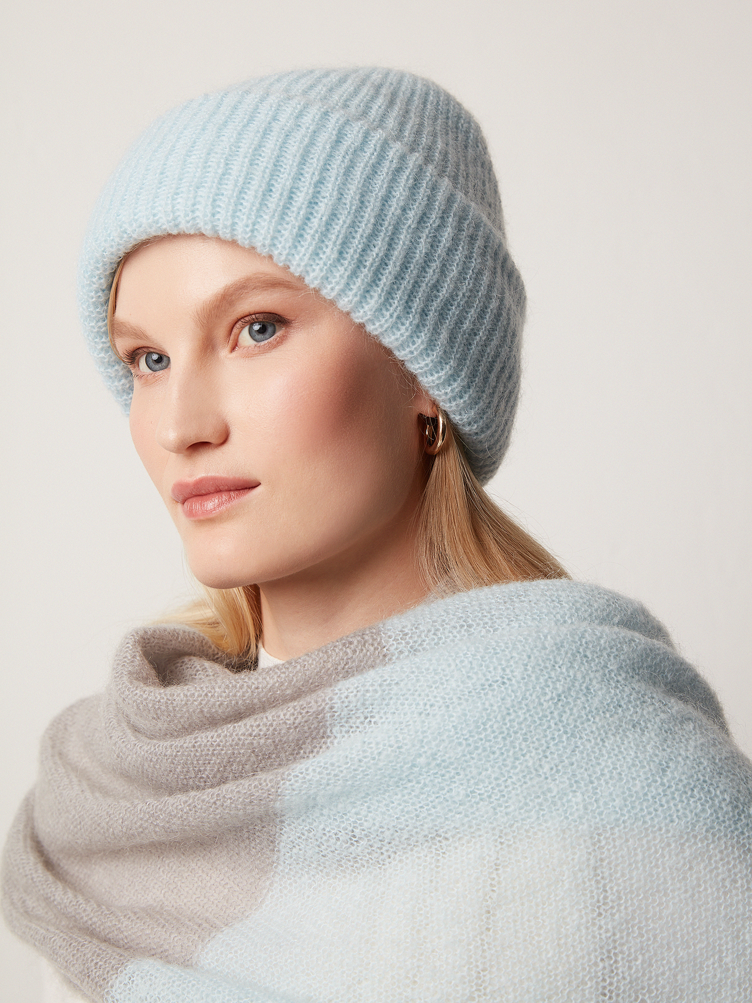 Трикотажная  шапка из тёплой миксовой пряжи на основе овечьей шерсти и мохера.  Модель голубого оттенка, связанная гладкой вязкой, мягко облегает голову. Аксессуар хорошо сочетается с шарфом и перчатками из той же коллекции.