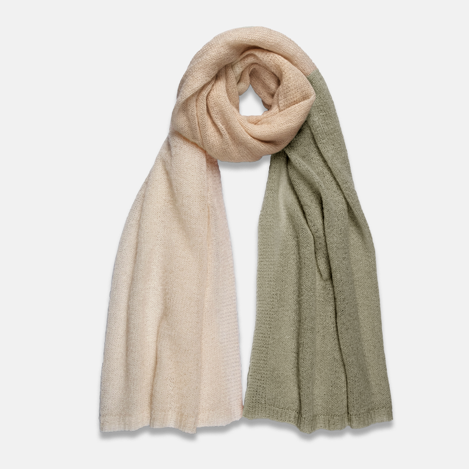 Теплый воздушный палантин - незаменимый аксессуар для холодной погоды. Шарф связан лаконично, завершен аккуратной узкой резинкой, добавляющей фактуру и интересный акцент. Цветовое решение палантина расширяет его стилистические возможности - сочетание бежевого и приглушенного зеленого позволяет завершать образ по-разному.Пряжа с особым смесовым составом делает аксессуар практичным, ведь в составе теплые мохер и овечья шерсть, мягкий акрил и прочный полиамид. Такой состав идеально сочетается с осенними и зимними пальто и пуховиками, а оригинальное цветовое решение позволяет дополнять шарфом образы в самой разной стилистике.