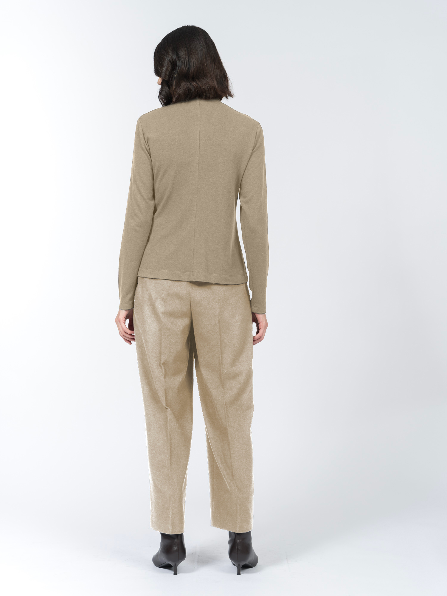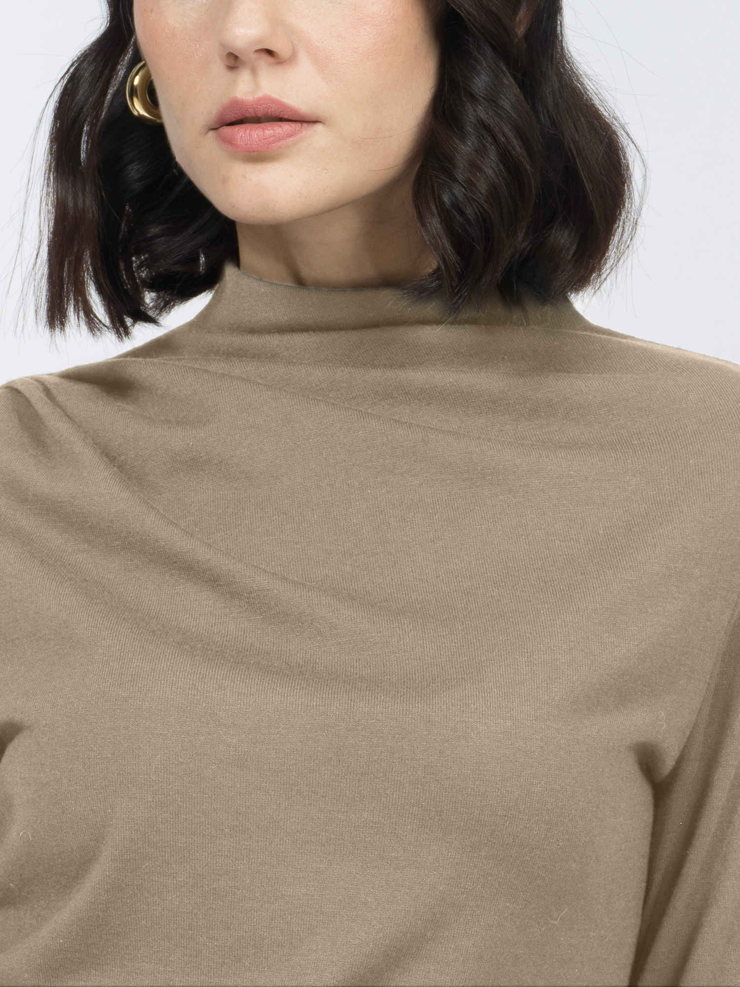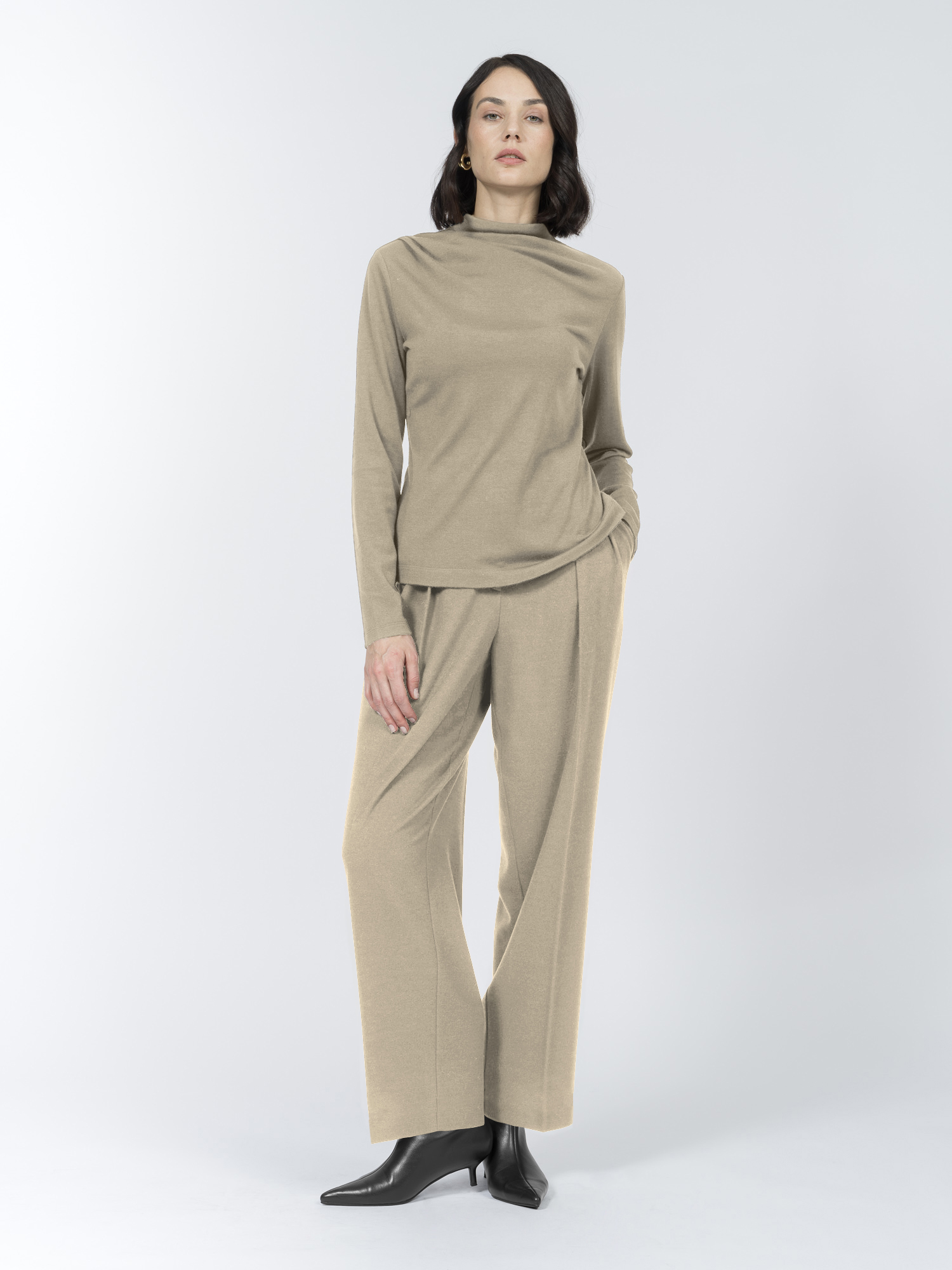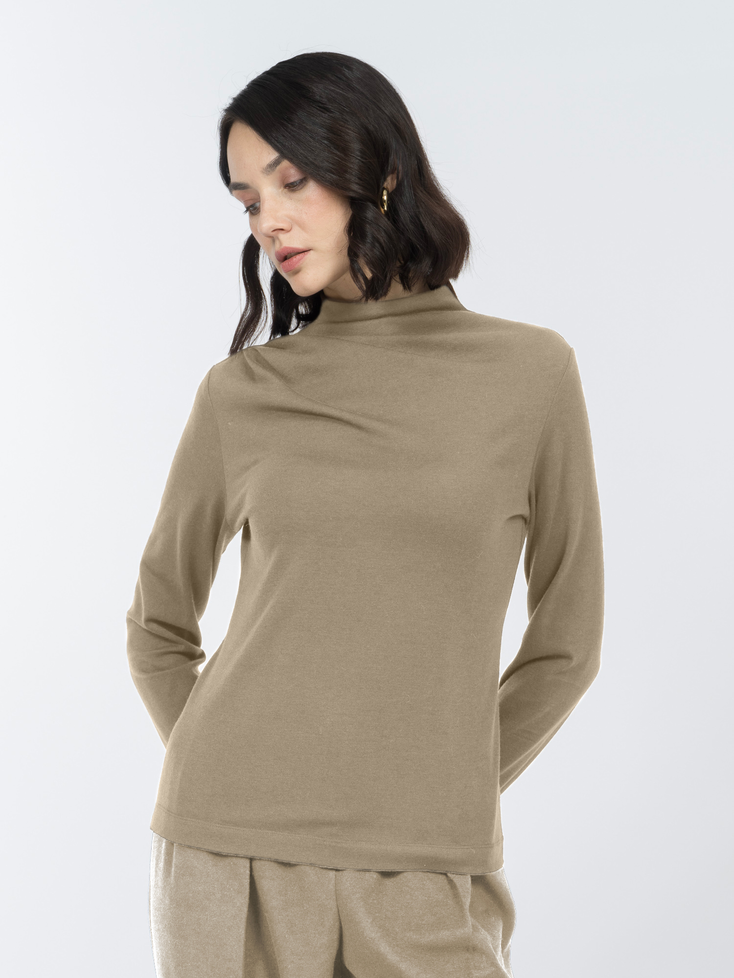 Трикотажная блуза с низкой цельнокроеной стойкой и длинными рукавами сшита из мягкой эластичной ткани. Согревающая овечья шерсть делает блузу теплой и уютной. Она хорошо тянется, удобно сидит и приятна на ощупь.Небольшая стойка и длинные рукава делают модель комфортной для осенне-зимнего сезона, а складки на плече образуют изящную асимметричную драпировку на груди, добавляя модели визуального интереса.