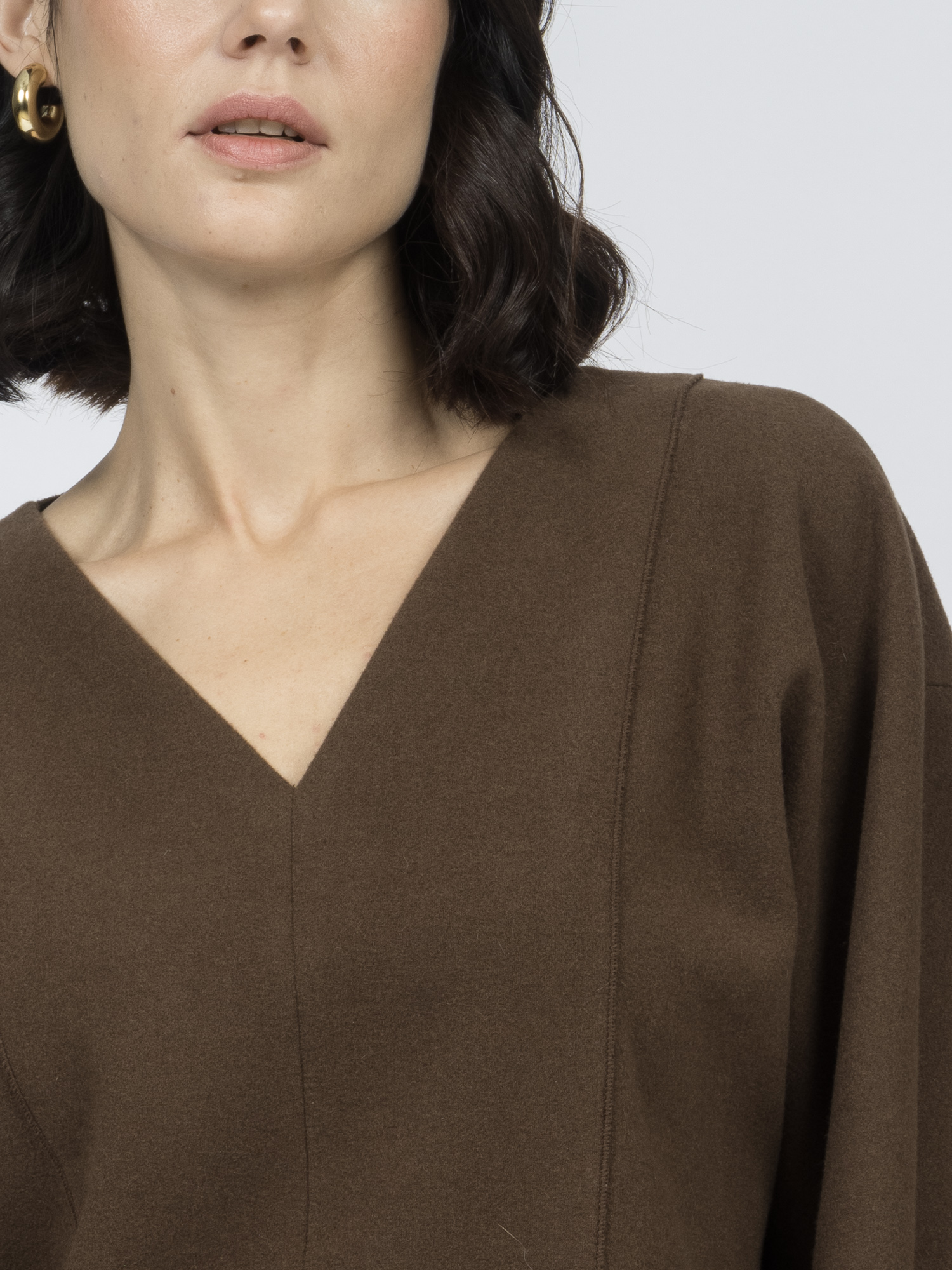 Блуза из смесового трикотажа мягко садится по фигуре и комфортна в носке. Состав ткани идеально сбалансирован: шерсть и хлопок дарят натуральный комфорт и тепло, вискоза добавляет мягкости, а полиэстер обеспечивает прочность.Глубокий V-вырез и особые рельефные вертикальные швы создают стройный силуэт. Комбинированный рукав - цельнокроеный спереди и втачной сзади - добавляет модели оригинальности.