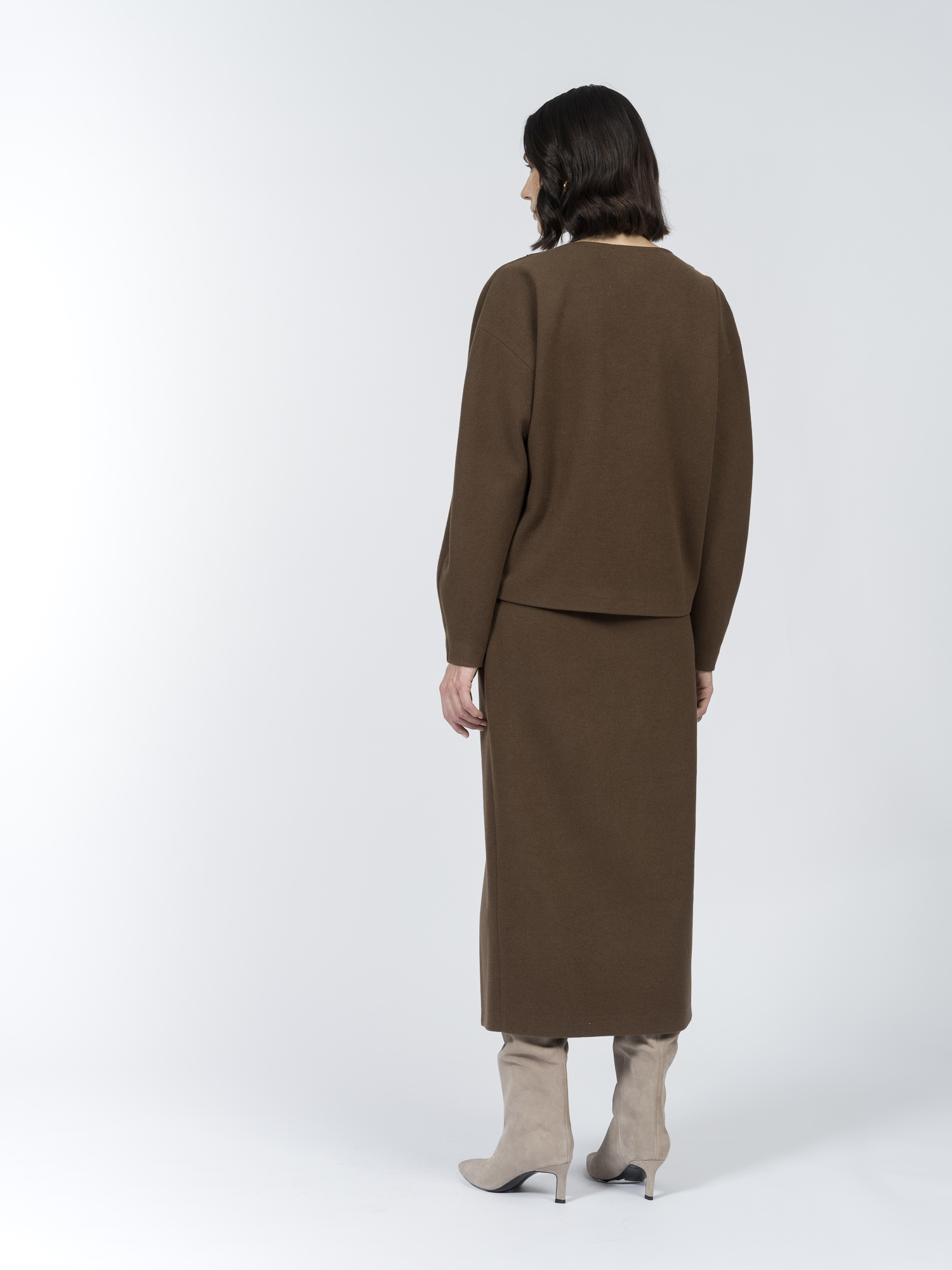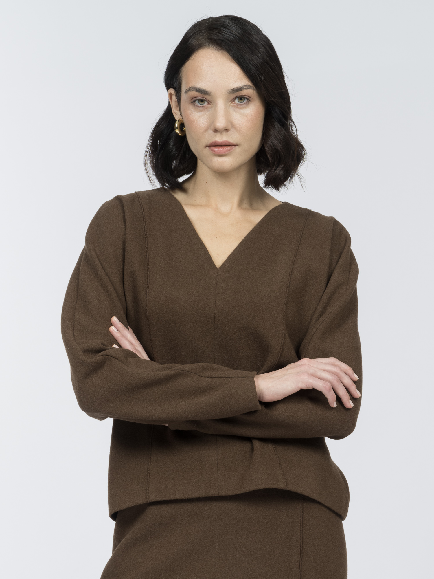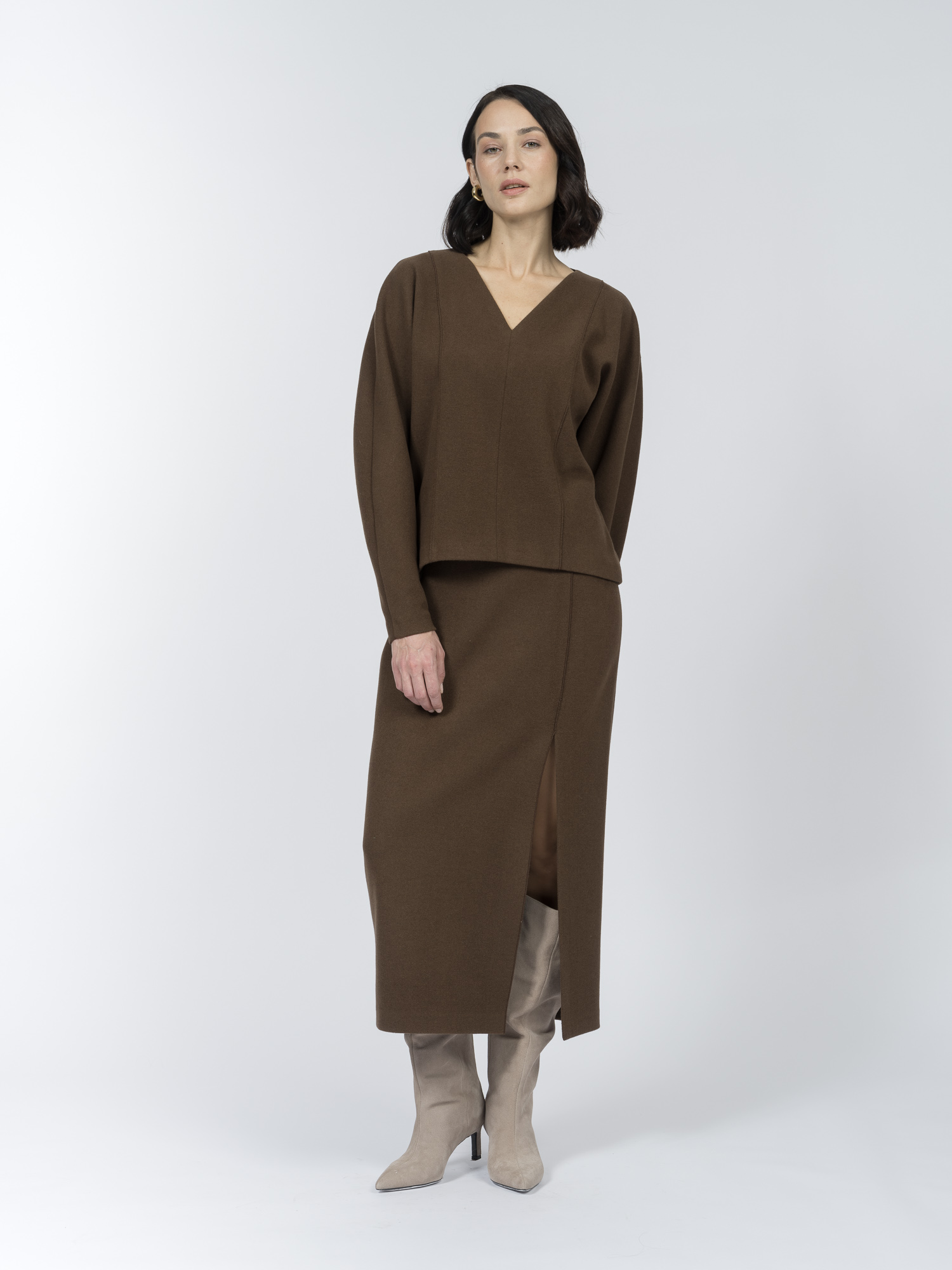 Насыщенный оттенок «шоколадный мартини» выглядит благородно и сочетается с юбкой SK0594K, брюками и джинсами коллекции.