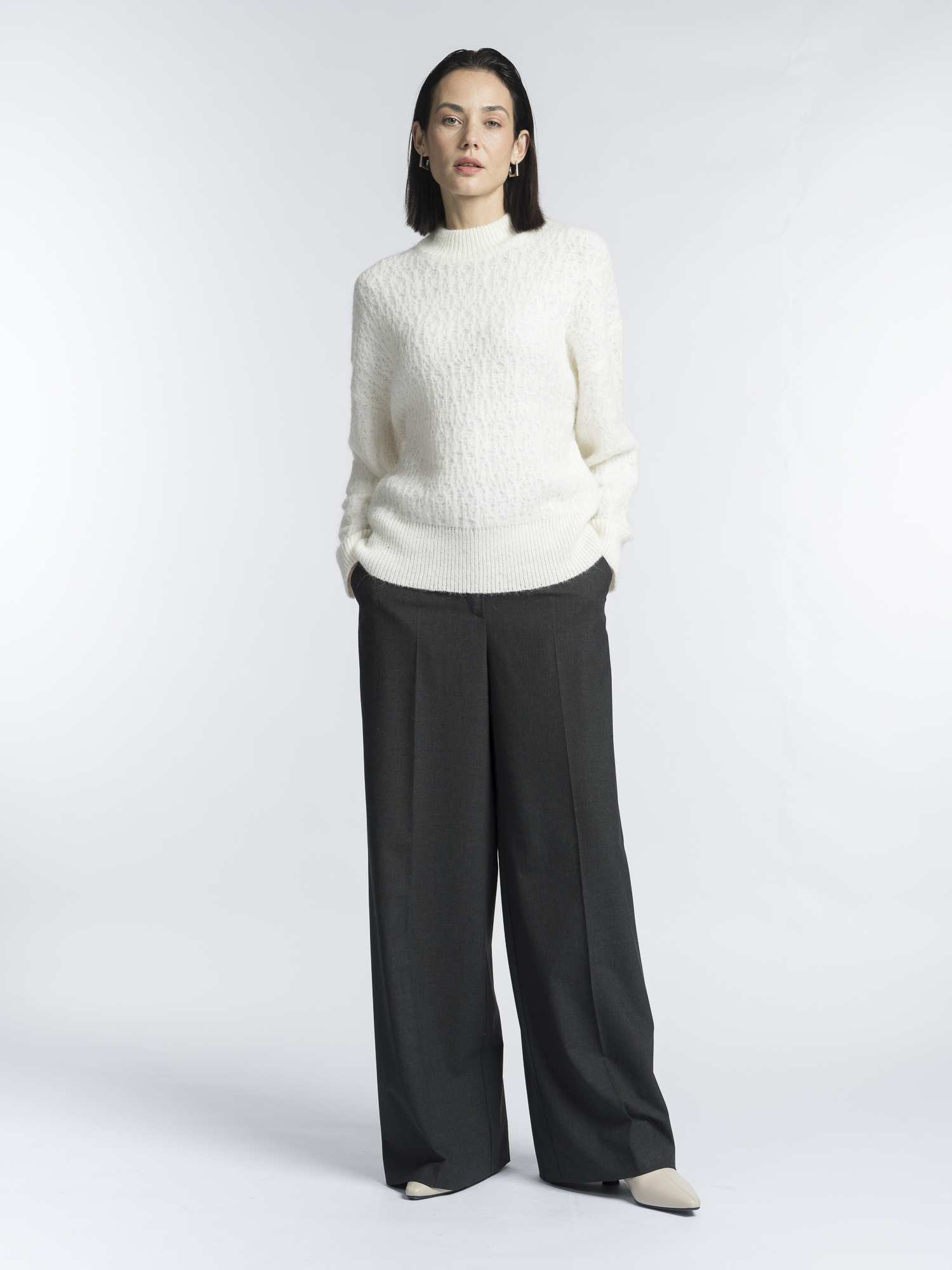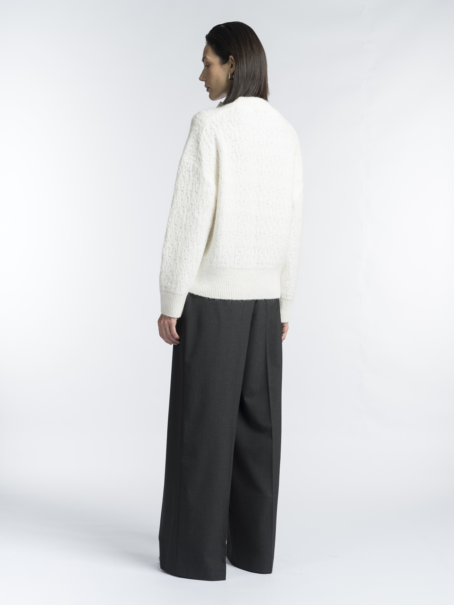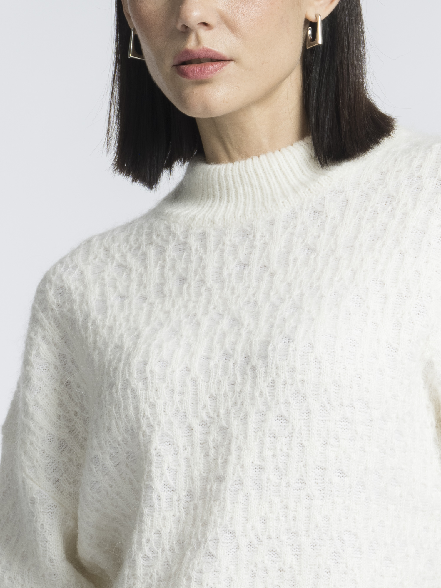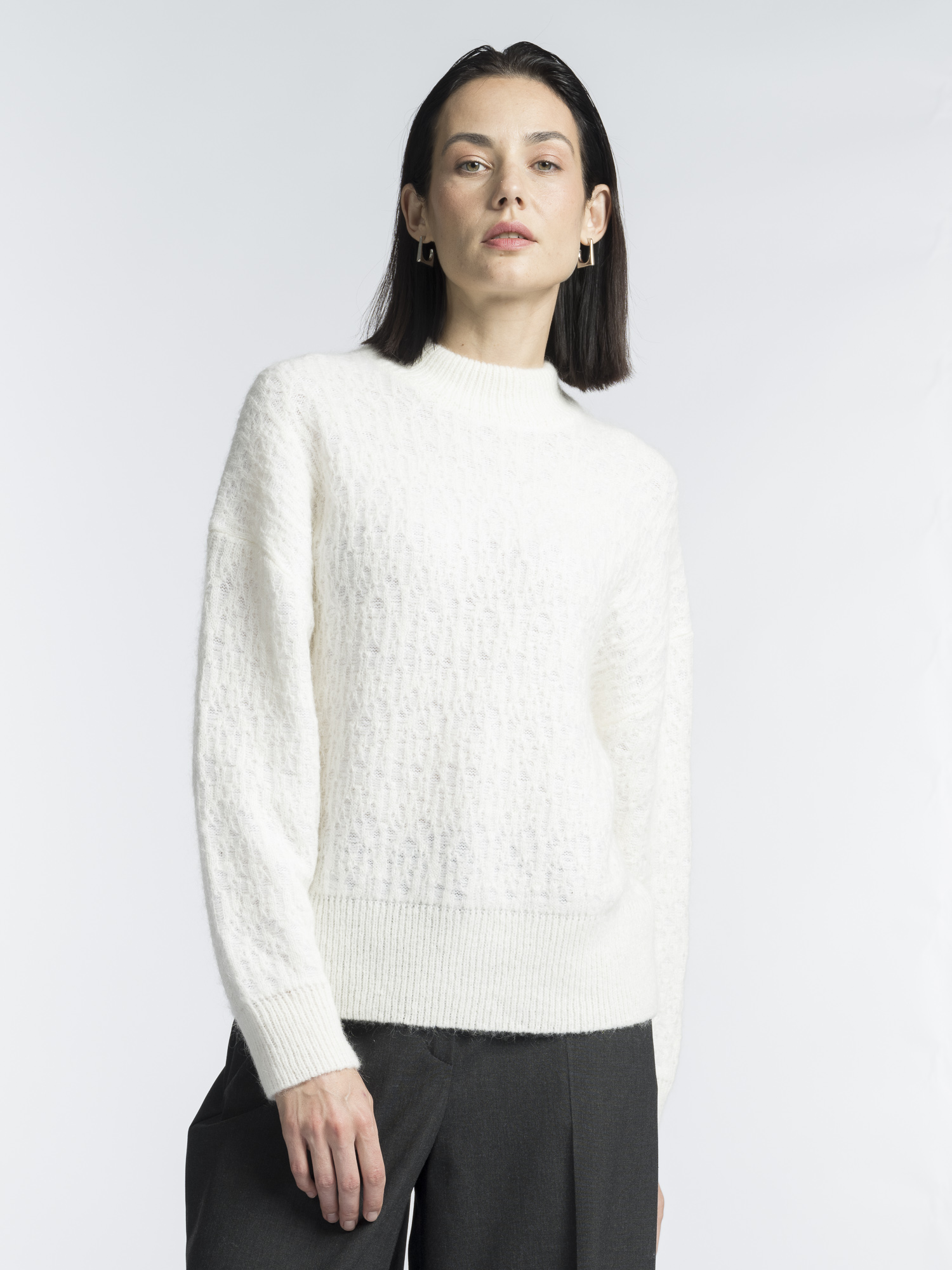 Жаккардовый узор, сотканный из множества нитей, формирует трехмерное переплетение, напоминающее кружево, резинка по горловине, запястьям и низу изделия завершает модель и дисциплинирует ее.