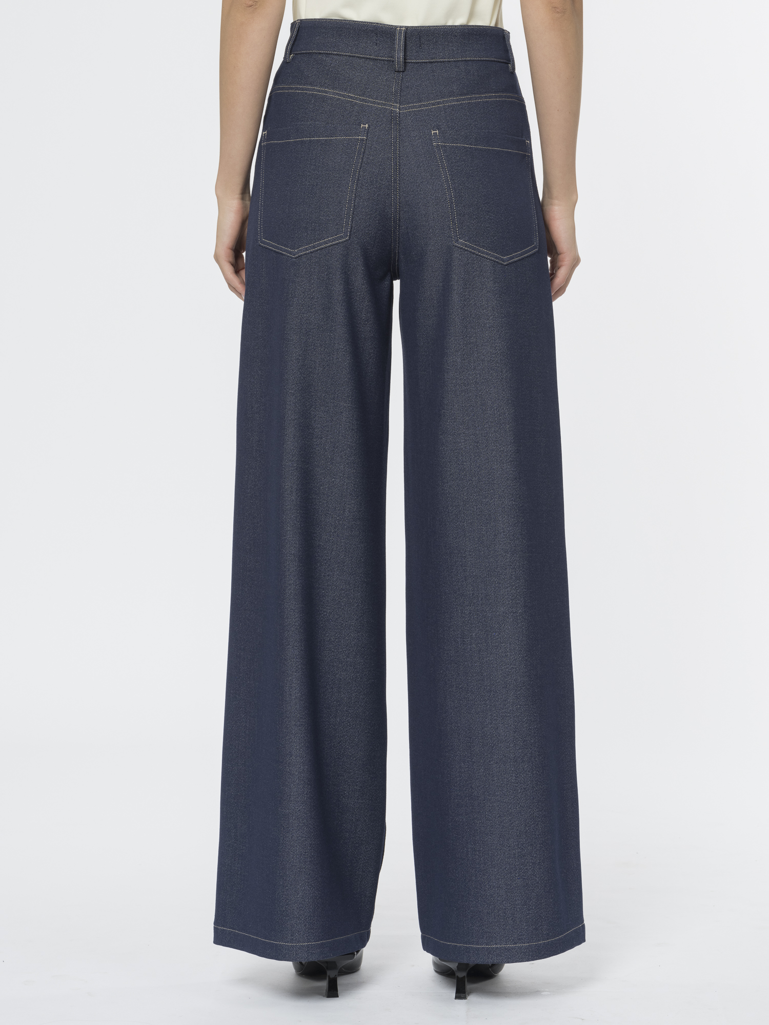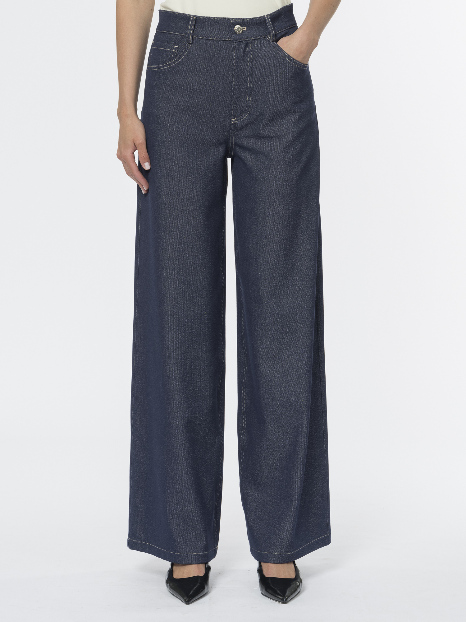 Широкие брюки джинсового кроя – идеальная пара для повседневной носки. Классическая пятикарманная модель с традиционным гульфиком на молнии и фирменной металлической заклёпкой создаёт узнаваемый денимный силуэт.Широкие брючины обеспечивают свободу движений, а эластичный материал добавляет удобства. Поливискозная ткань меланжевого оттенка с неоднородным окрашиванием придаёт образу стильную небрежность.
