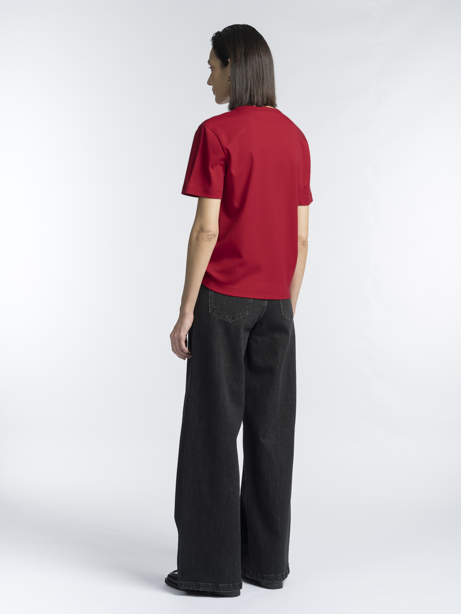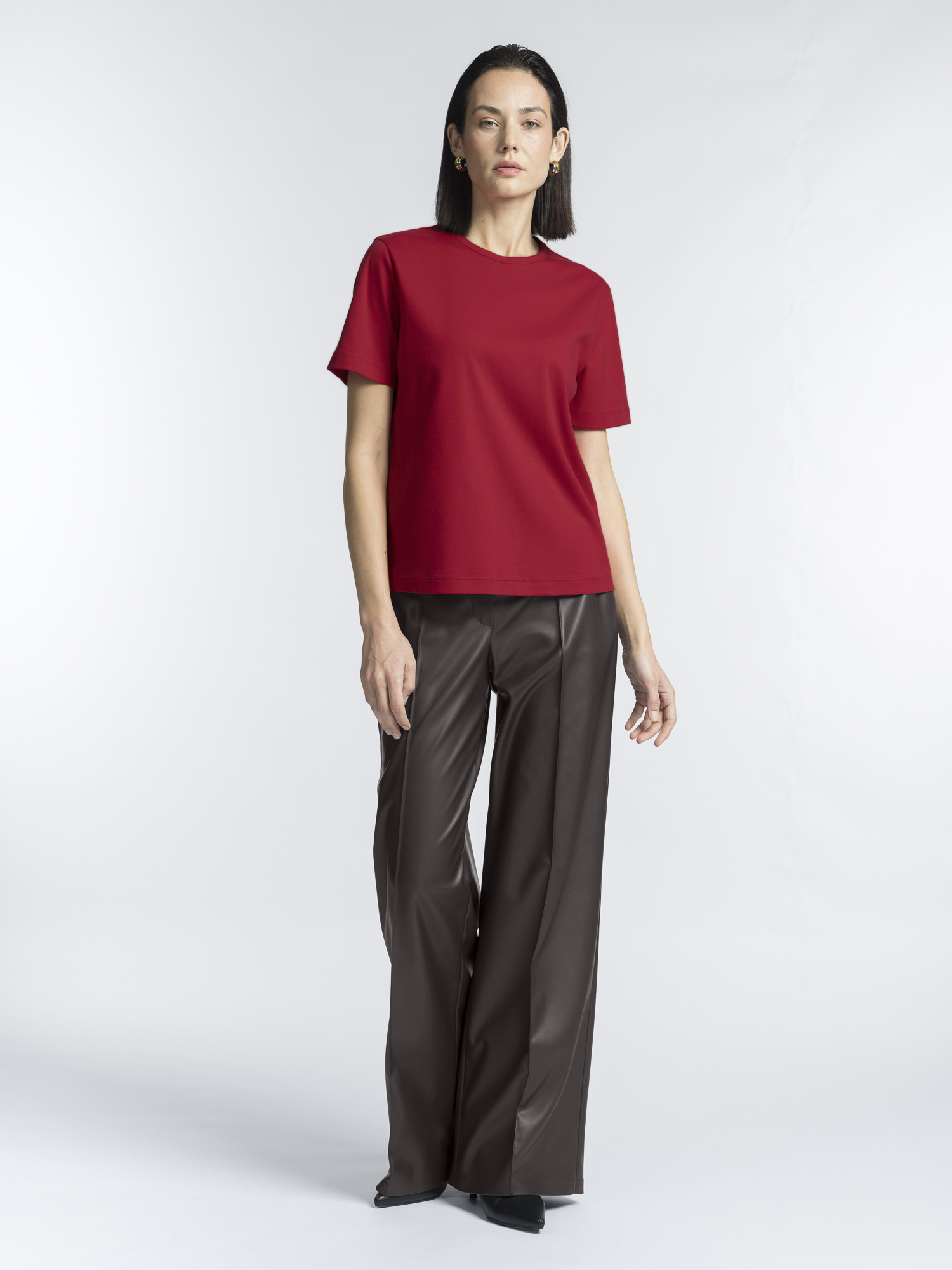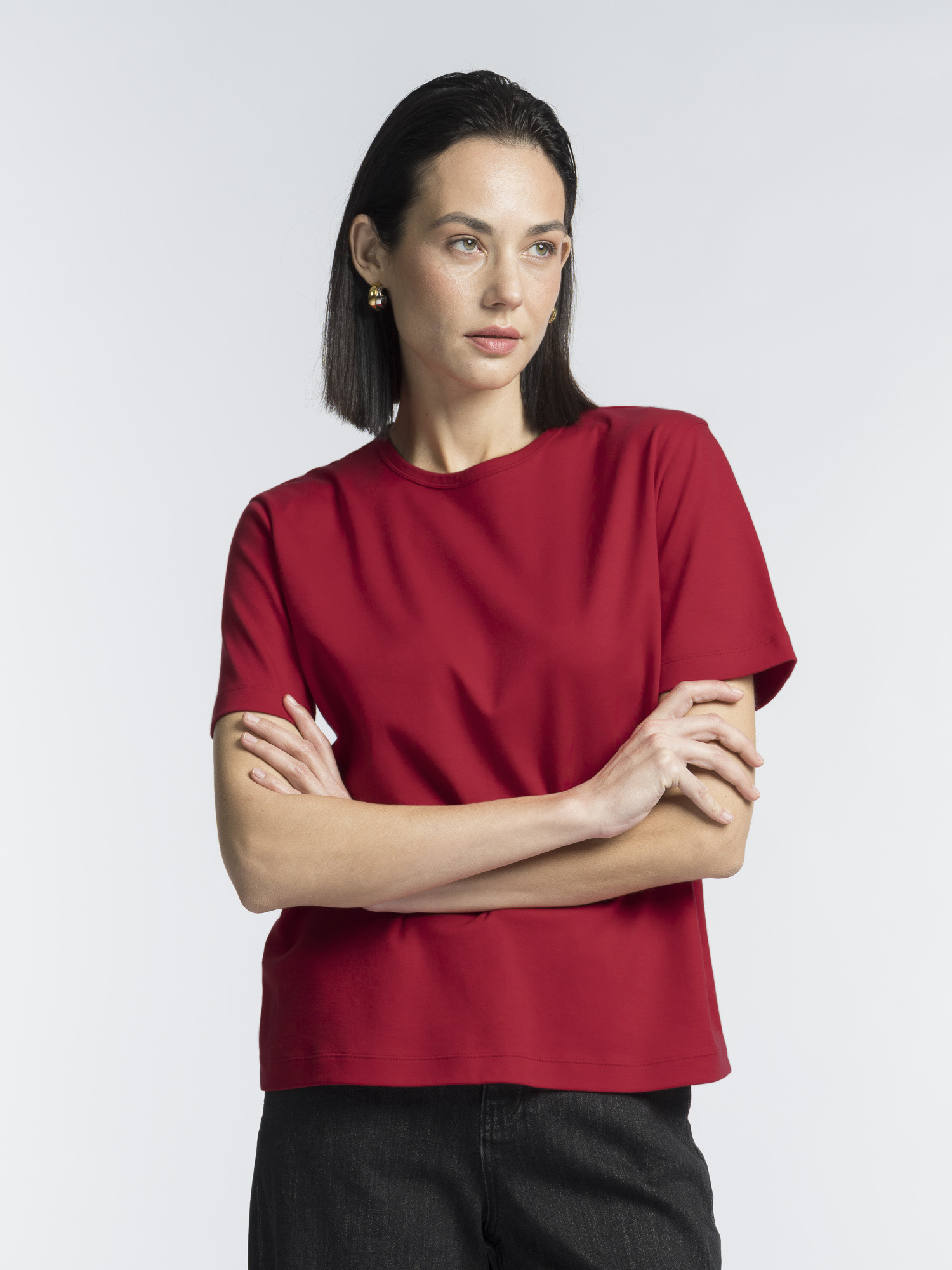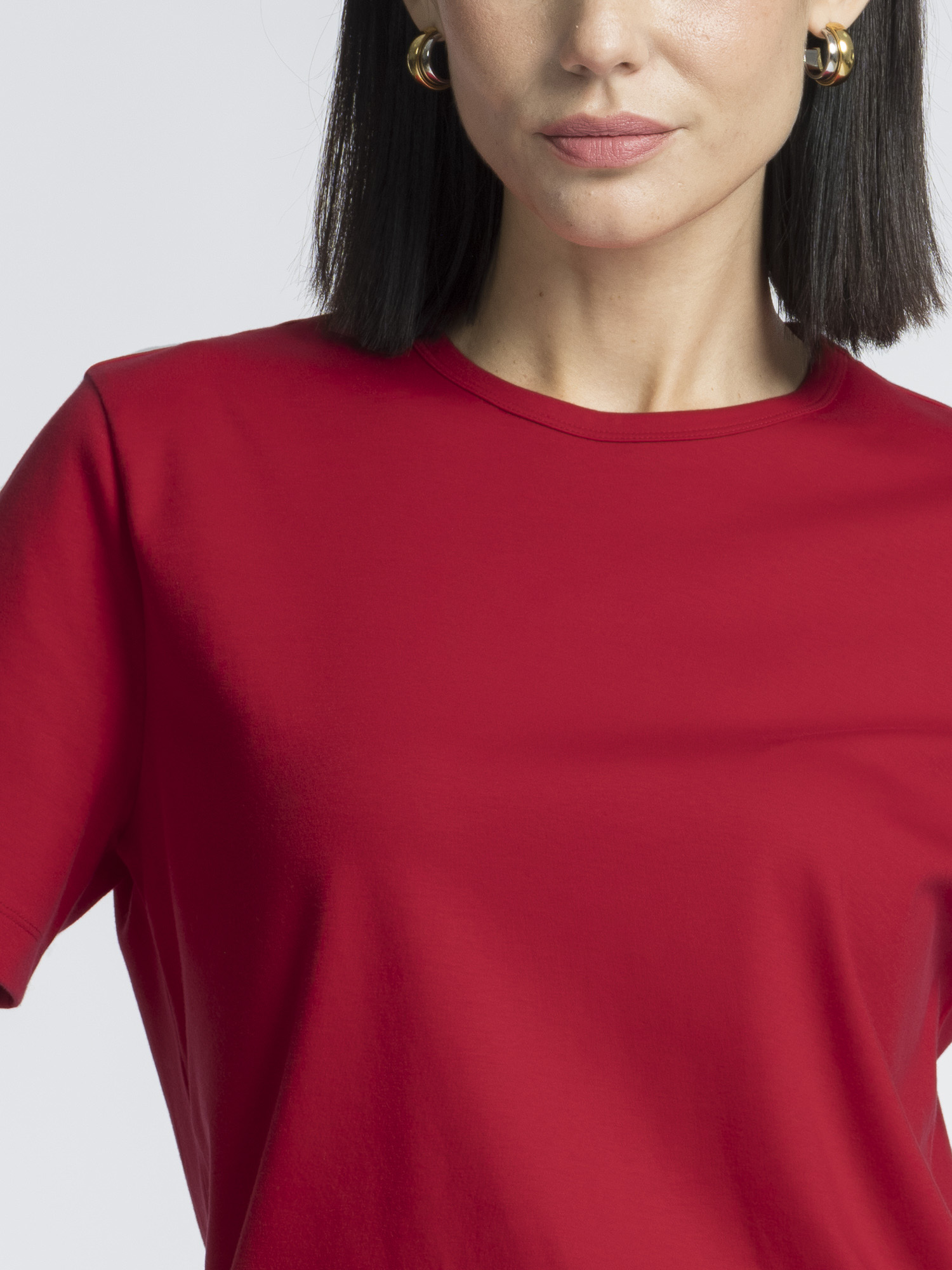 Малиновый оттенок футболки, без излишней яркости, прекрасно вписывается в палитру осеннего гардероба и станет ее акцентом.