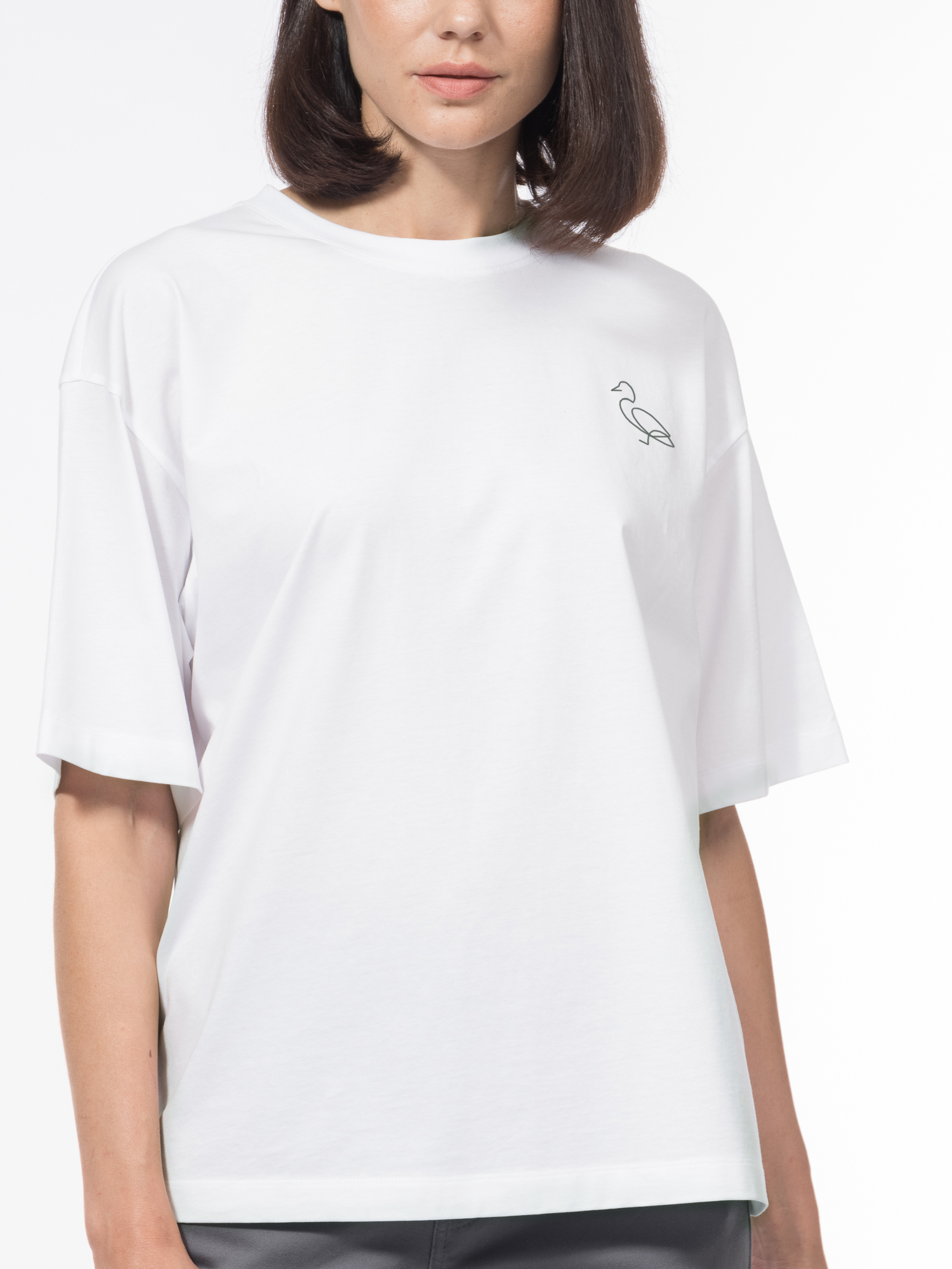 Футболки увеличенного объема вне времени, они практичны, комфортны и универсальны. Натуральный хлопок, послуживший сырьем для трикотажного полотна, тактильно приятен, гипоаллергенен и воздухопроницаем, это гарантирует максимальный комфорт.Отделка выреза хлопковым трикотажем в рубчик добавляет интересный акцент и повышает эластичность и формоустойчивость выреза. Минималистичное изображение уточки, нанесенное с помощью современного оборудования для печати по ткани, придает футболке уникальность и оригинальность, превращая её из базового элемента гардероба в стильный акцент.