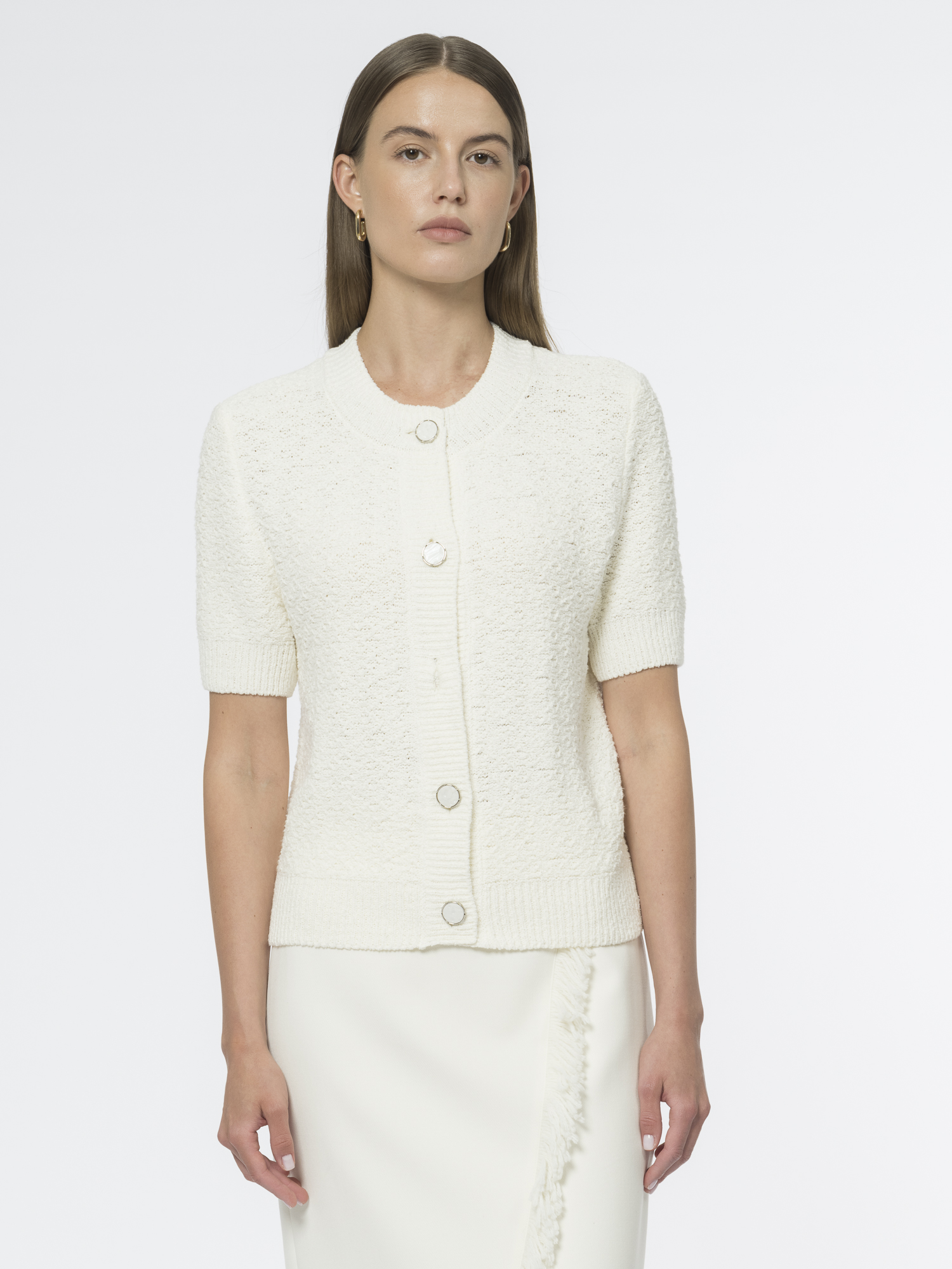 Вязаный жакет с коротким рукавом – идеальный вариант для тех, кто ценит качество и элегантность. Выполнен из итальянской буклированной пряжи с хлопком, которая создаёт уникальную текстуру, напоминающую благородный твид.Короткие рукава и эффектная застёжка на перламутровые пуговицы делают кардиган похожим на твидовый жакет, но более лёгким и удобным для повседневной носки.