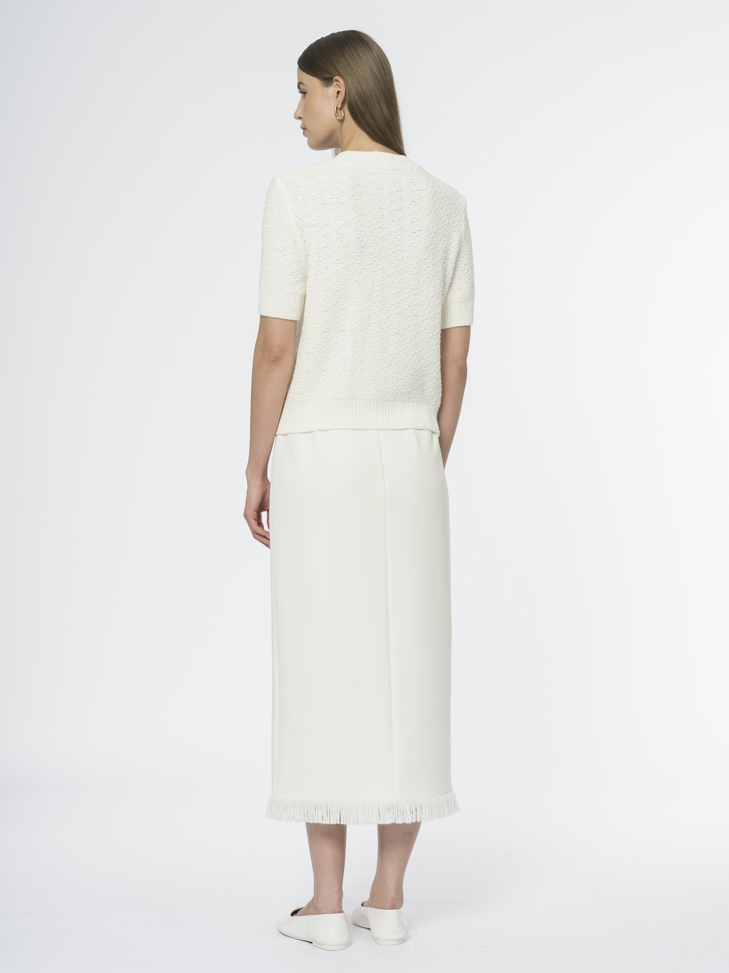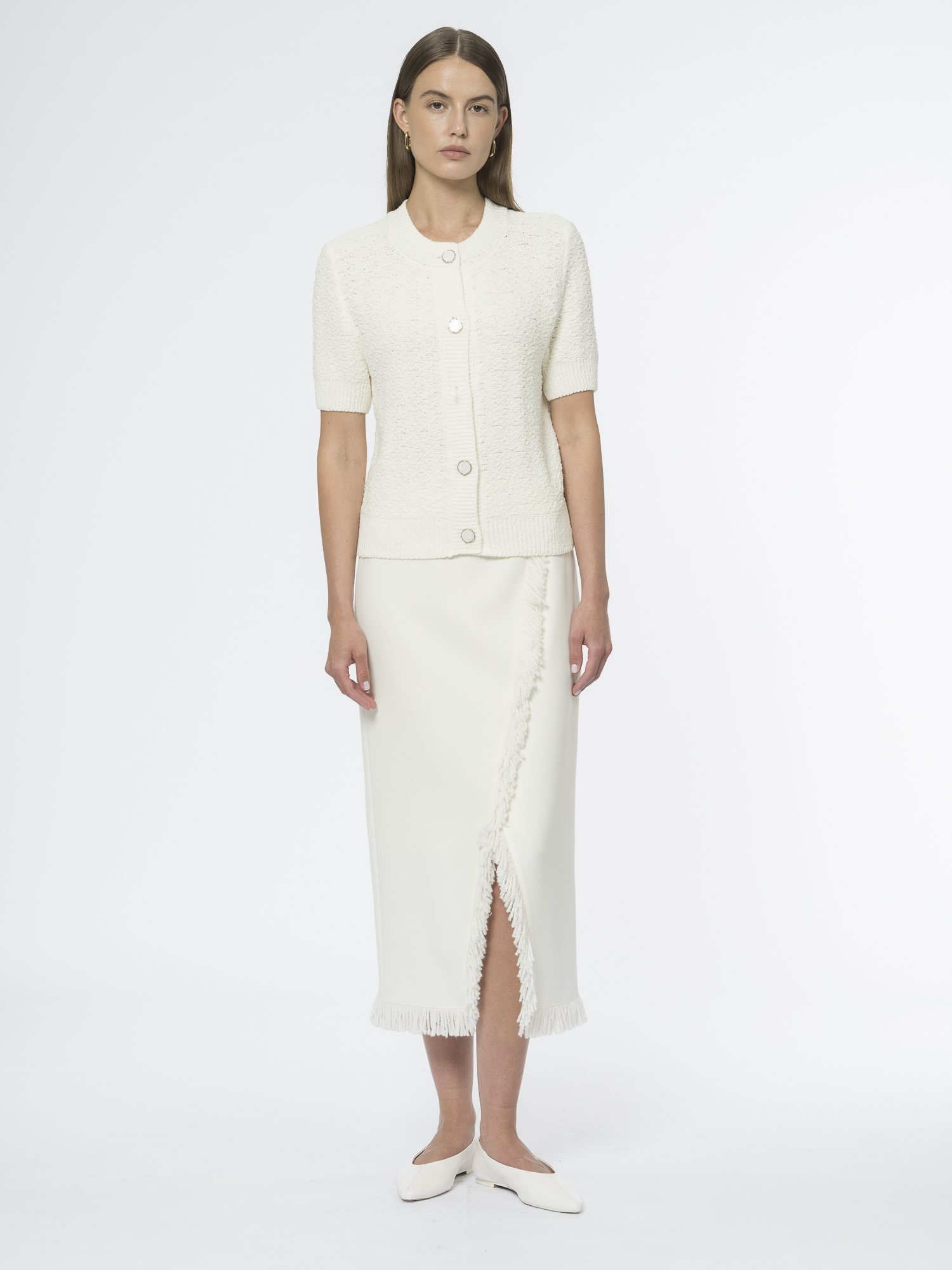 Кардиган из уникальной молочной пряжи прекрасно дополнит юбку с бахромой SK0628.