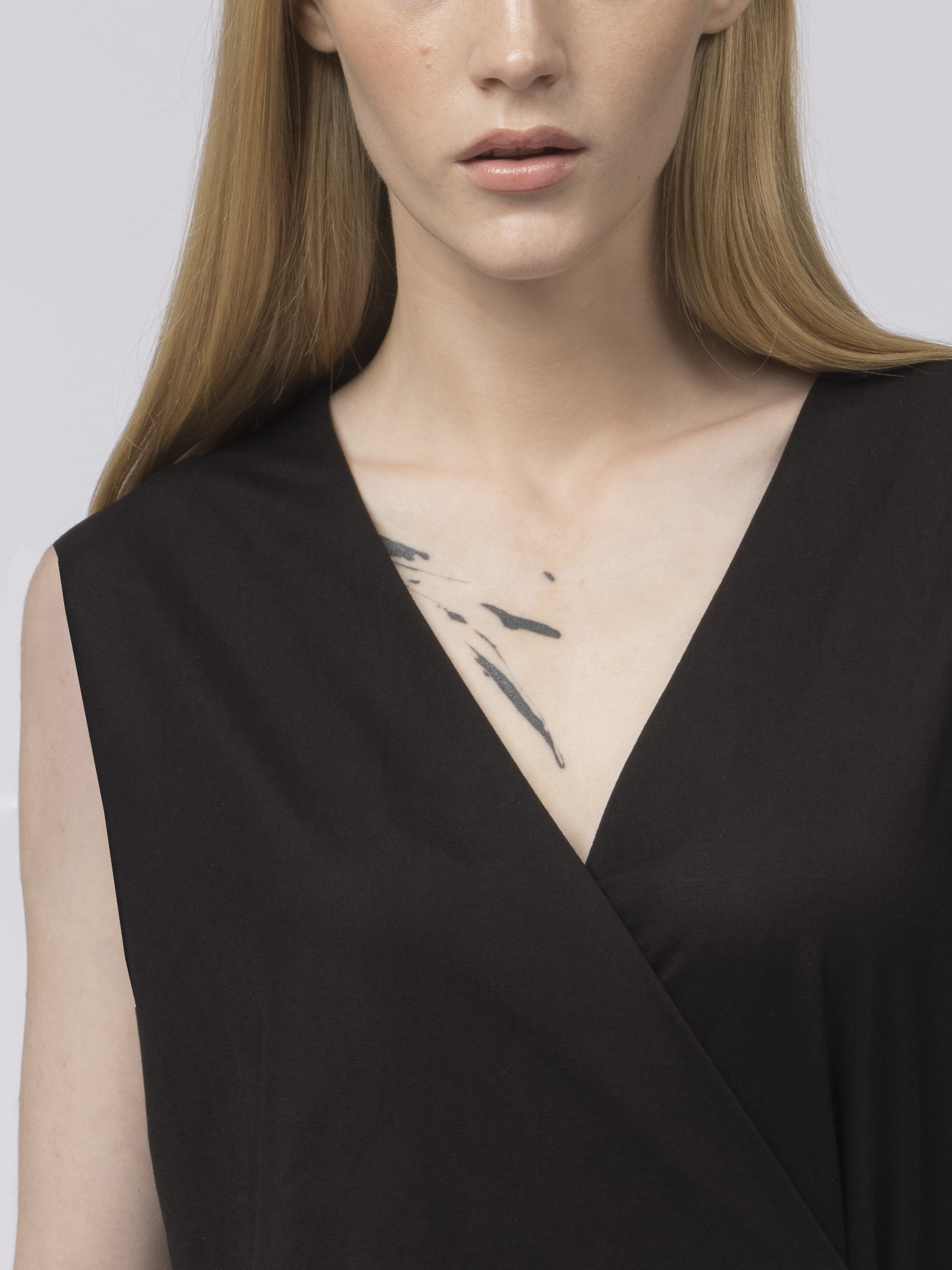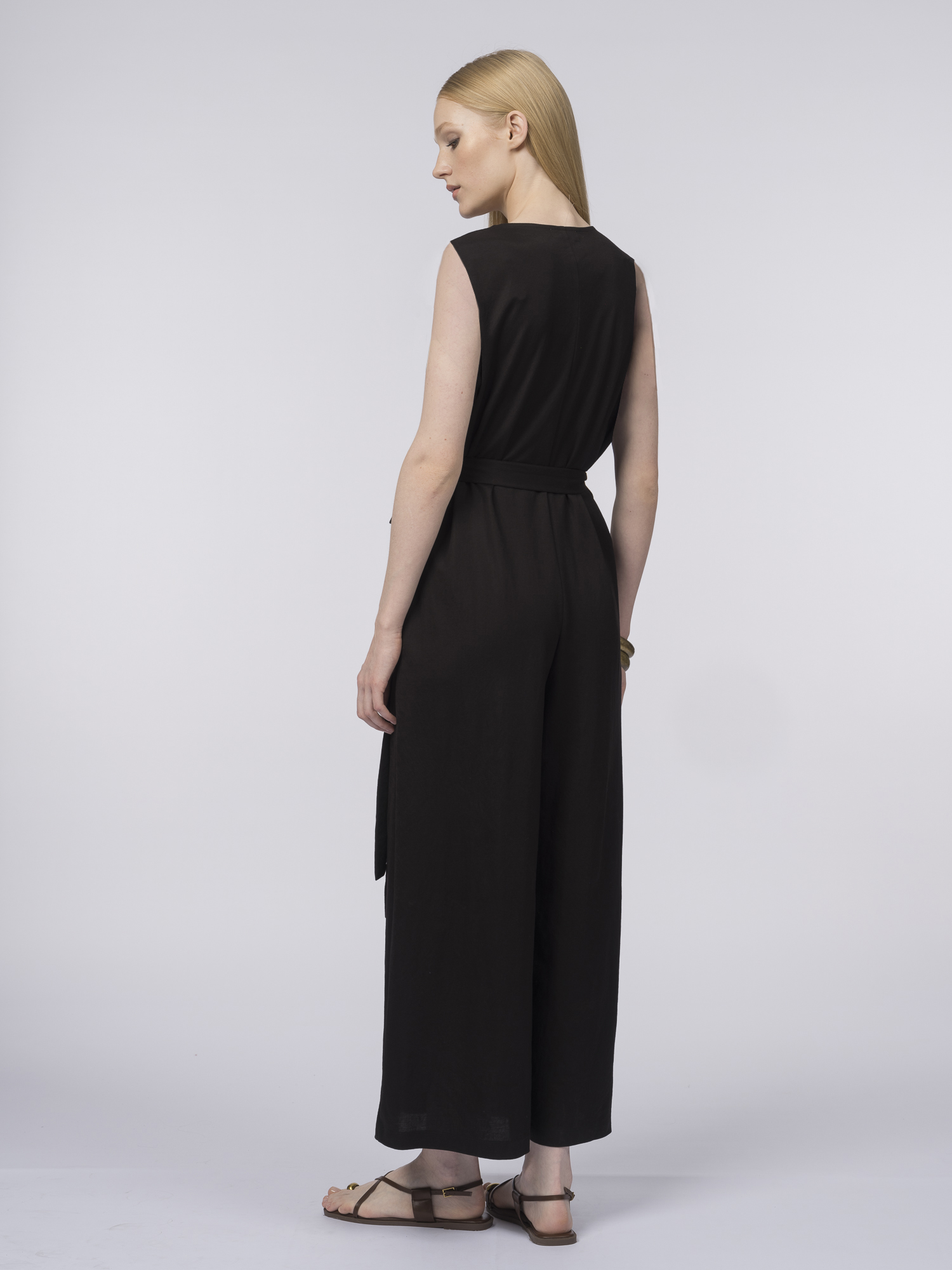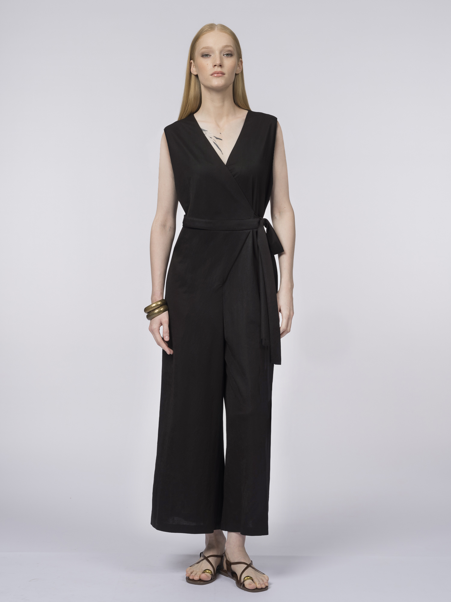 Черный комбинезон с эффектным запахом – стильное и удобное решение для тех, кто ценит лаконичность с изюминкой. Сшитый из мягкого трикотажа из вискозы с нейлоном, он приятно облегает фигуру, позволяя коже дышать, при этом прекрасно держит форму.Глубокий V-вырез, созданный запахом, и длинный пояс, обвивающий талию, делают силуэт женственным и выразительным. Удобные карманы добавляют практичности, а отсутствие рукавов делает модель идеальной для теплых дней.