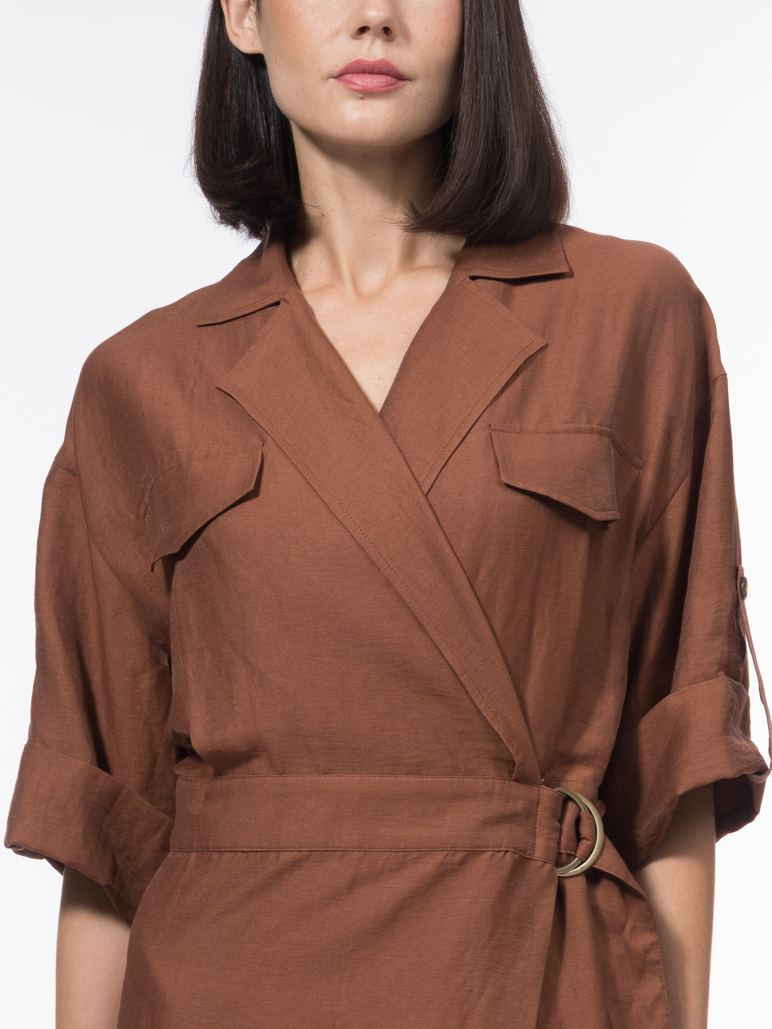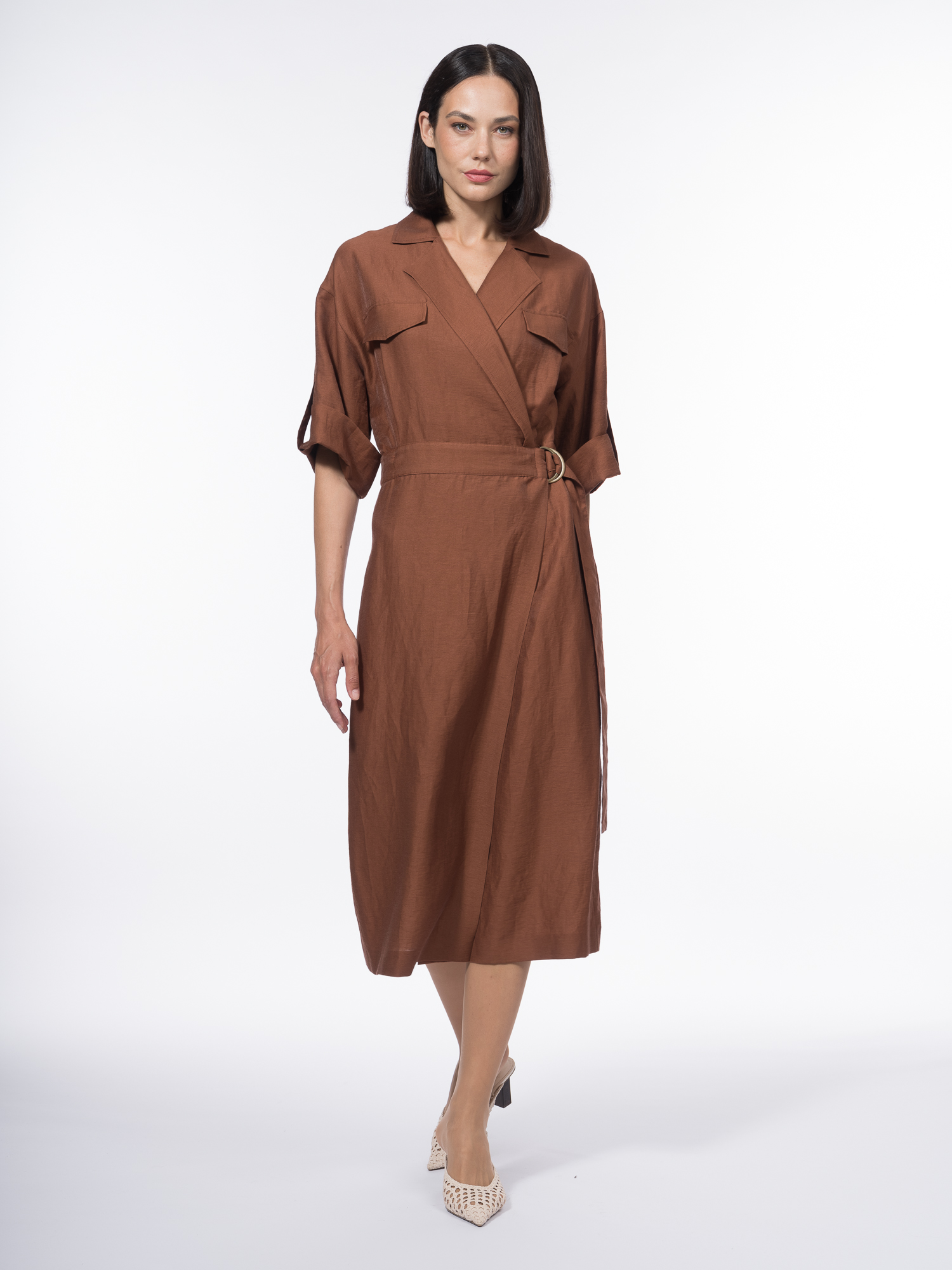 Платье длины миди, выполненное изо льна и вискозы, представляет собой идеальное сочетание стиля и комфорта. Вискоза обеспечивает мягкость и способность дышать, лен добавляет натуральную текстуру и прочность, а нейлон повышает износостойкость и легкость в уходе. К тому же, лен обладает уникальной способностью к терморегуляции, что делает модель походящей не только для весны, но и для лета.Приталенный силуэт платья с поясом подчеркивает фигуру. ЗапАх отражает стремление дизайнеров к асимметрии, что делает платье актуальным в этом сезоне. Имитация нагрудных карманов с клапанами придает модели стильный и практичный вид, позволяя отнести платье к повседневному стилю. Паты на рукавах являются функциональным элементом, позволяющим регулировать длину рукава, что добавляет дополнительную гибкость в стилизации.