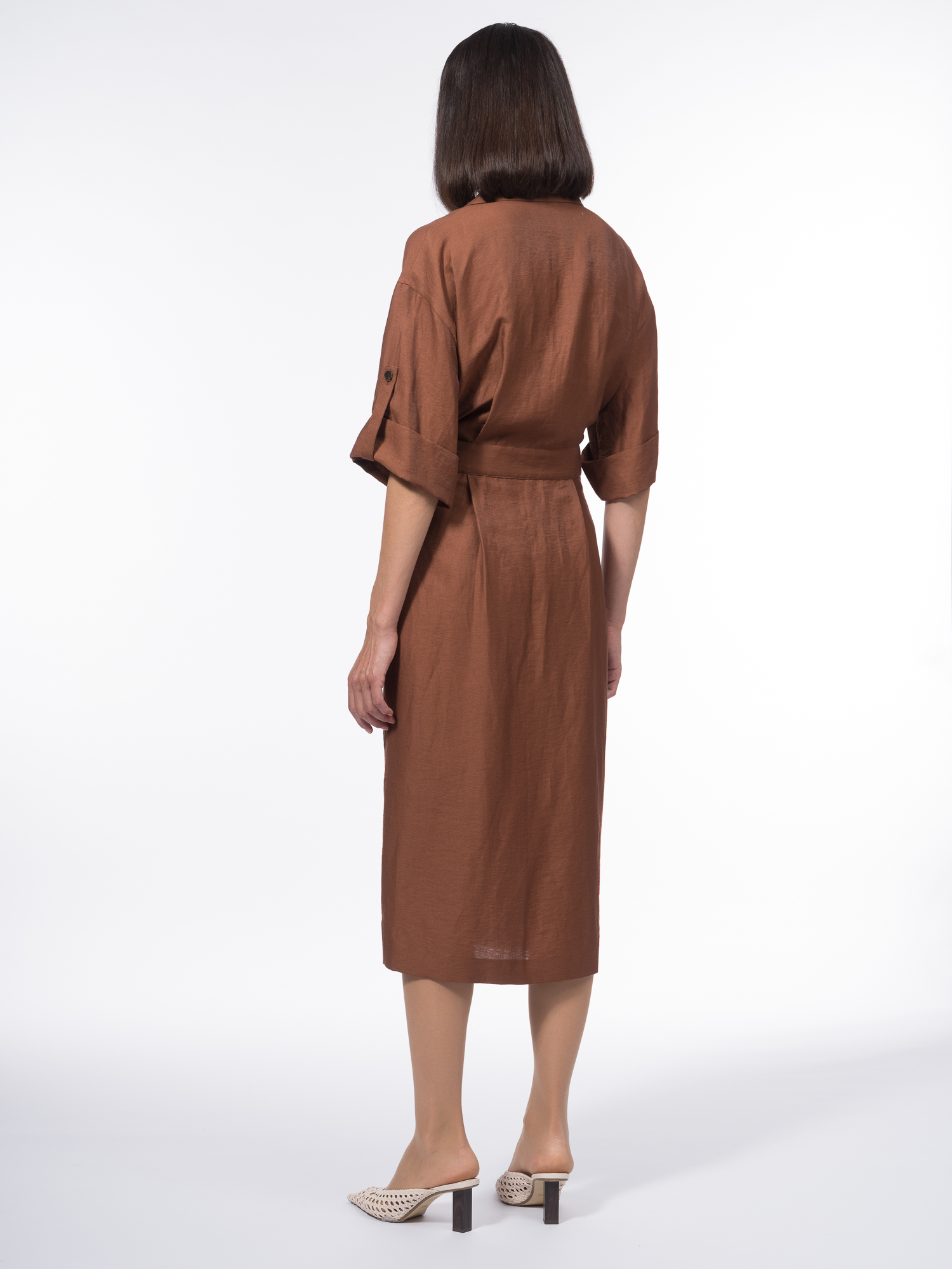 Цвет платья — теплый и насыщенный золотисто-коричневый оттенок - ассоциируется с элегантностью и роскошью. Это платье станет отличным дополнением как для делового гардероба, так и для вечерних выходов, позволяя Вам выглядеть стильно и уверенно в любой ситуации.