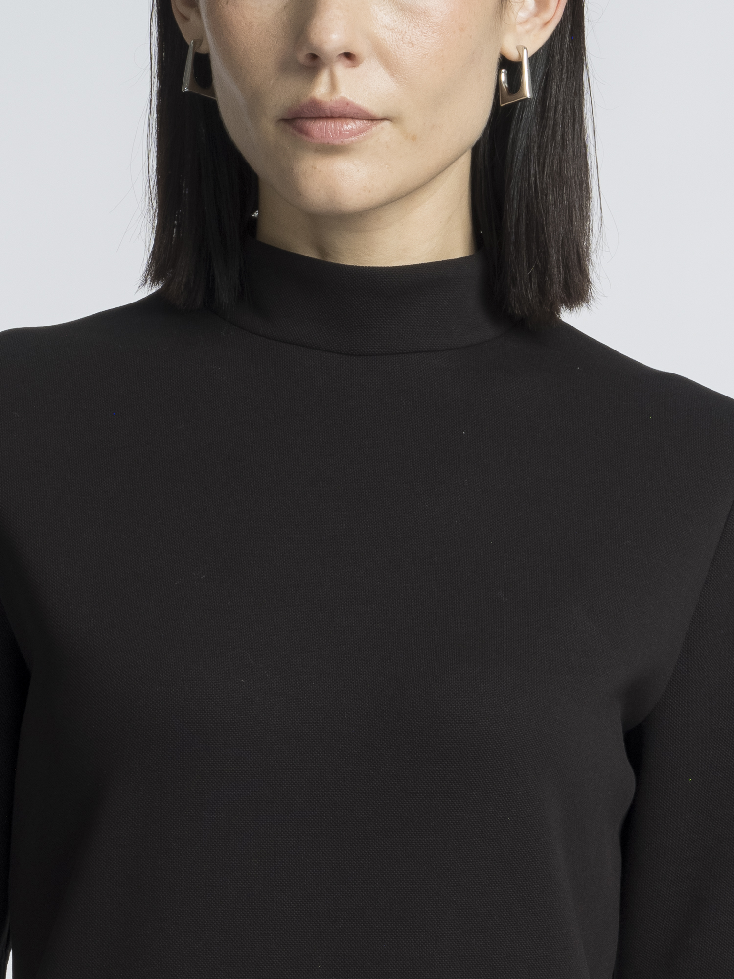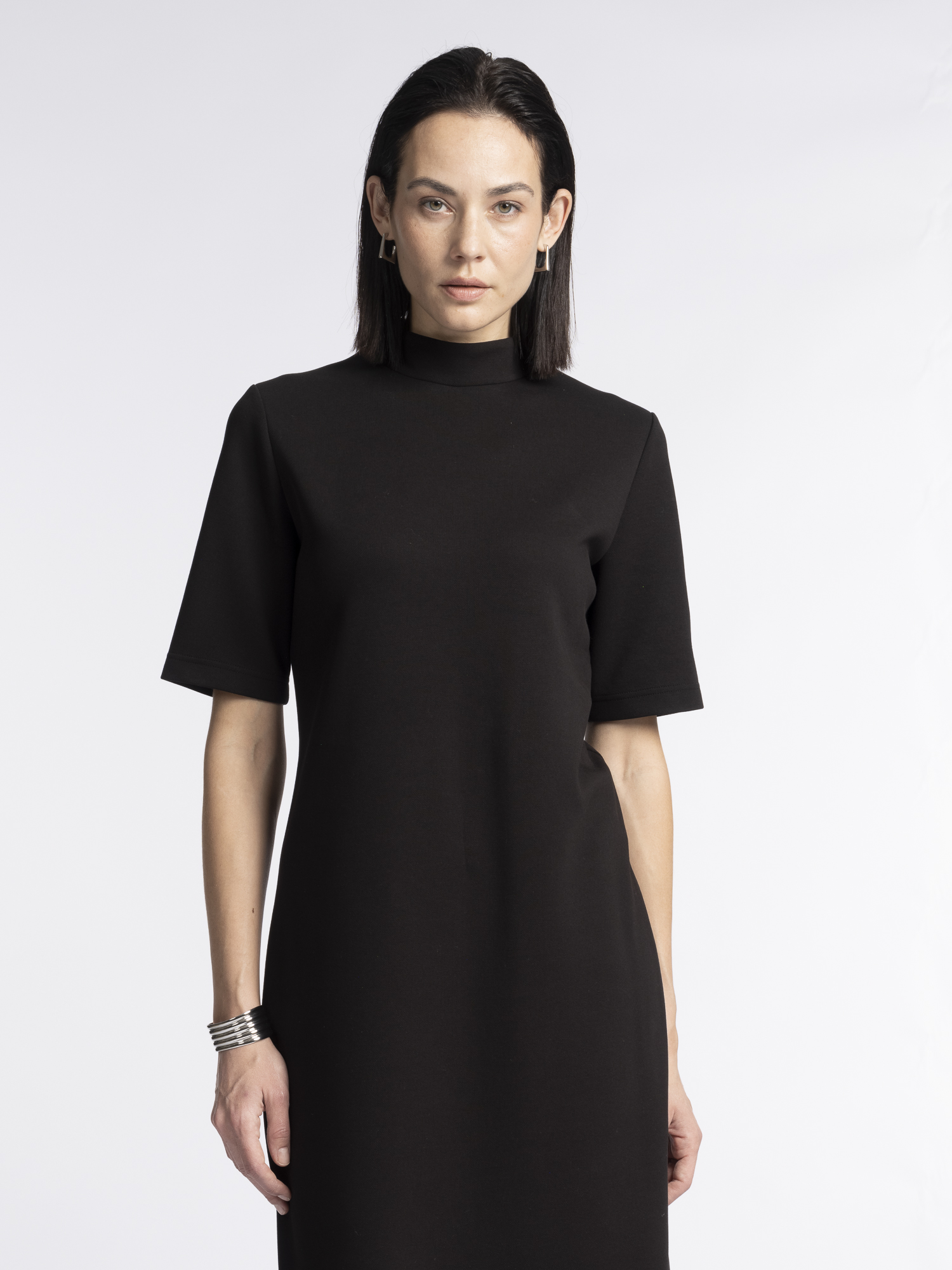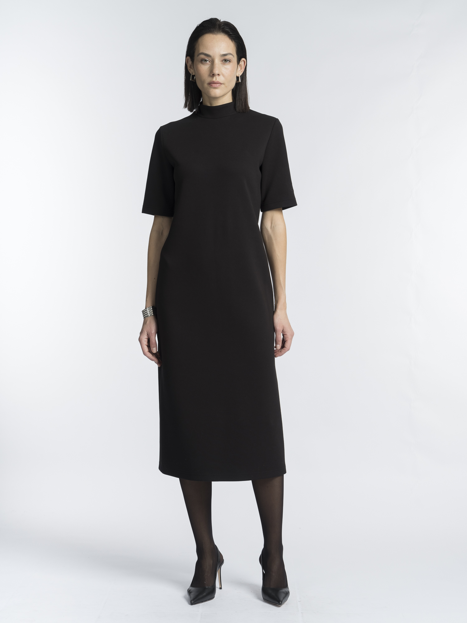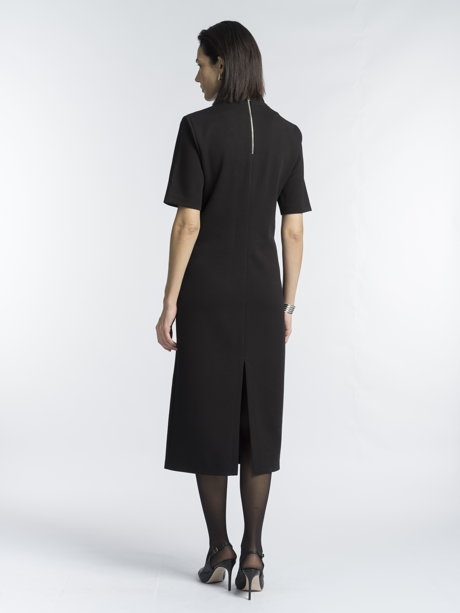 Минималистичное платье в классическом черном незаменимо в базовом гардеробе. Модель отличается отрезным воротником-стойкой, коротким втачным рукавом и аккуратным полуприлегающим силуэтом, дополнена удобной застежкой на спине на потайную молнию и разрезом для комфорта шага.Выбрали для платья трикотаж "пике" с хлопком и модифицированной вискозой, характеризующийся тактильным комфортом, прочностью и возможностью сохранять тепло за счет структуры неопрена. Декорировали рукав изделия брендированной вышивкой, выполненной на собственном производстве полного цикла.