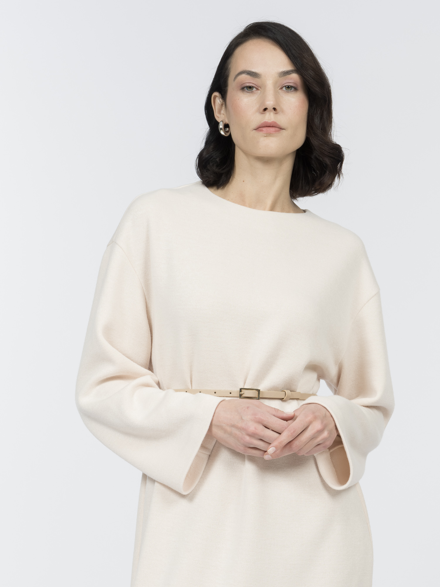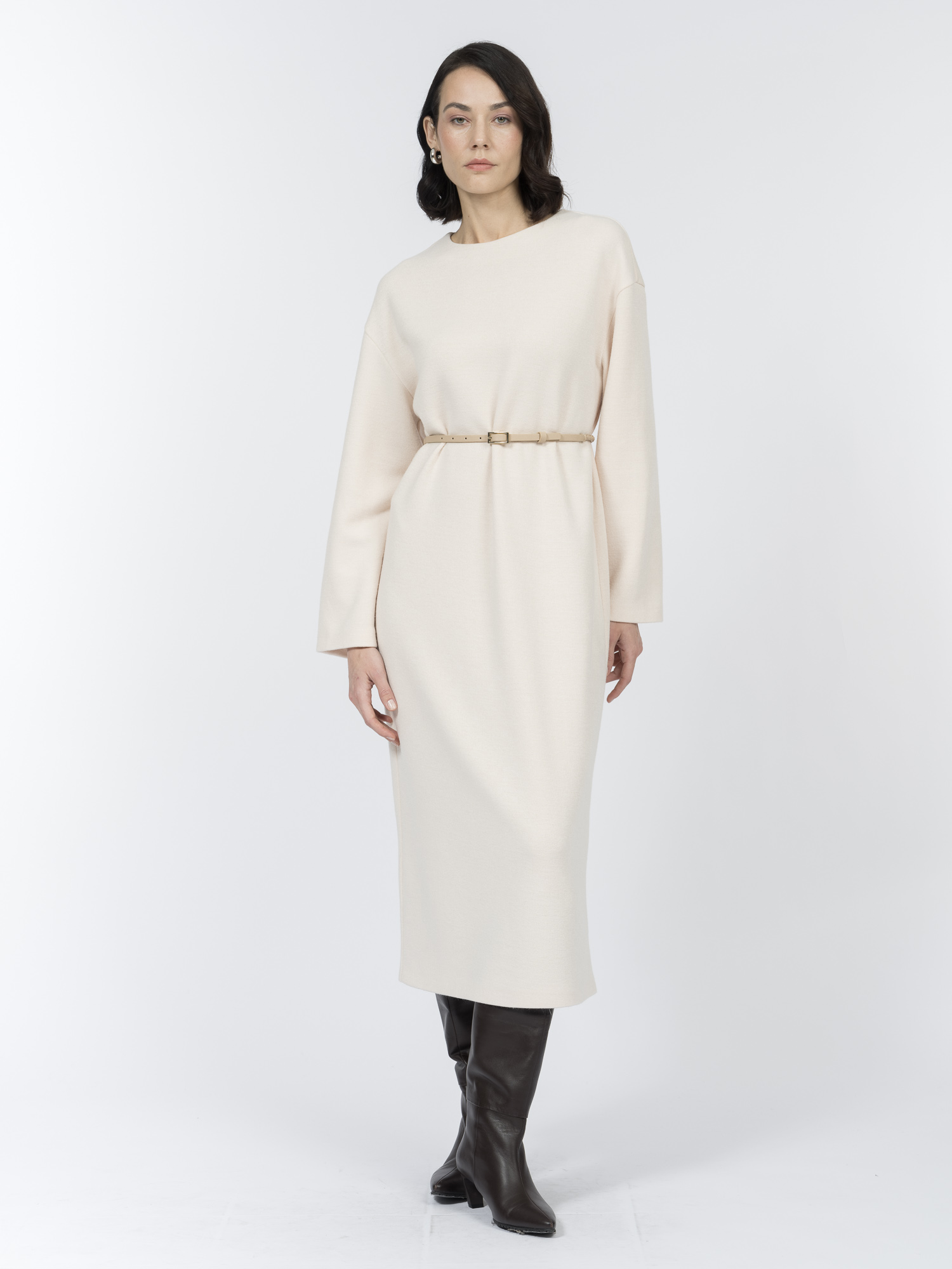 Платье прямого кроя, подчеркивающего только достоинства, сшито из практичного трикотажа с высоким содержанием поливолокон. Платье хорошо тянется, удобно сидит и приятно на ощупь.Модель с круглым вырезом и длинными рукавами со спущенным плечом подходит для повседневной носки. В комплекте есть ремень, который можно добавить, чтобы подчеркнуть талию.