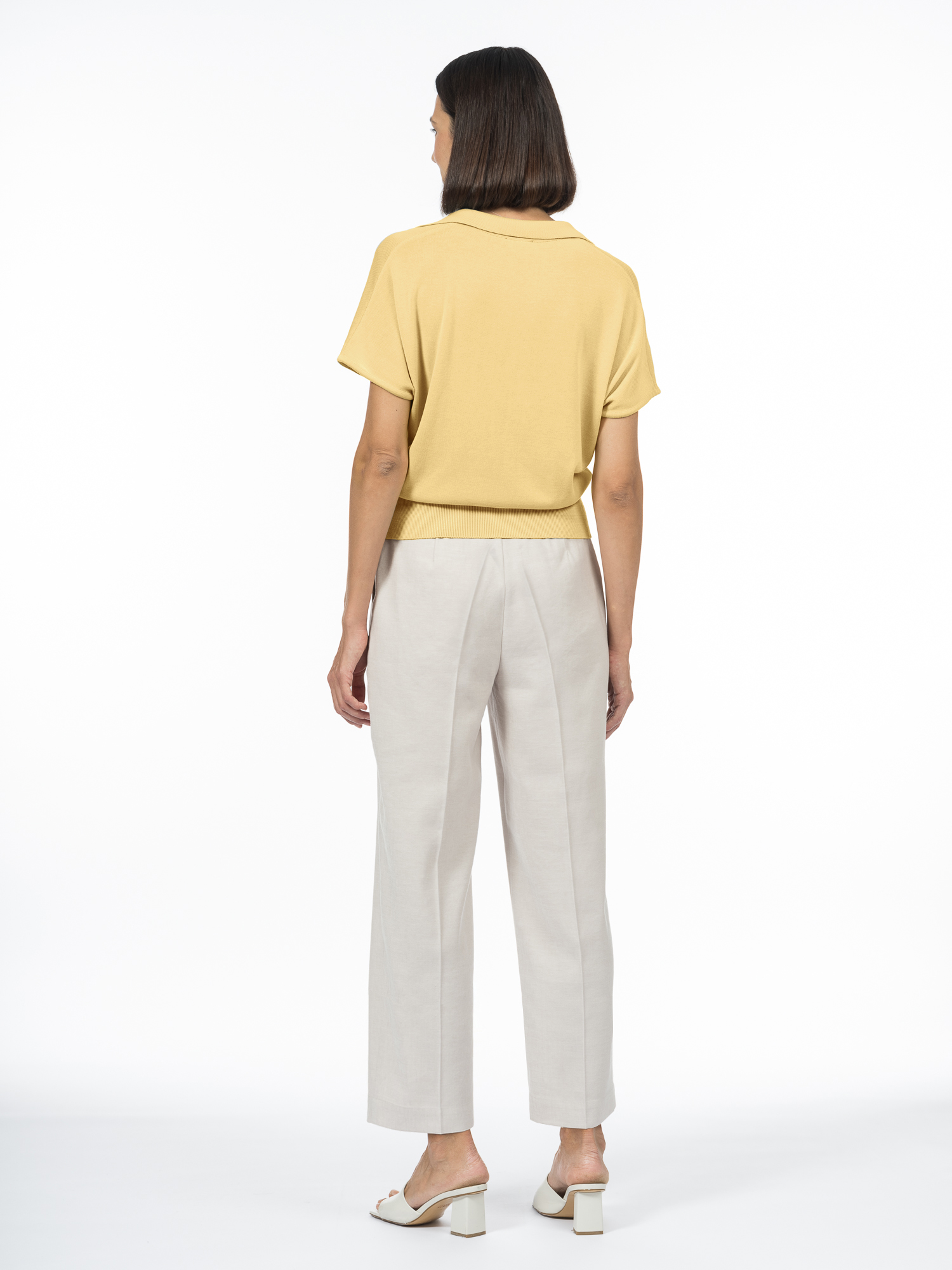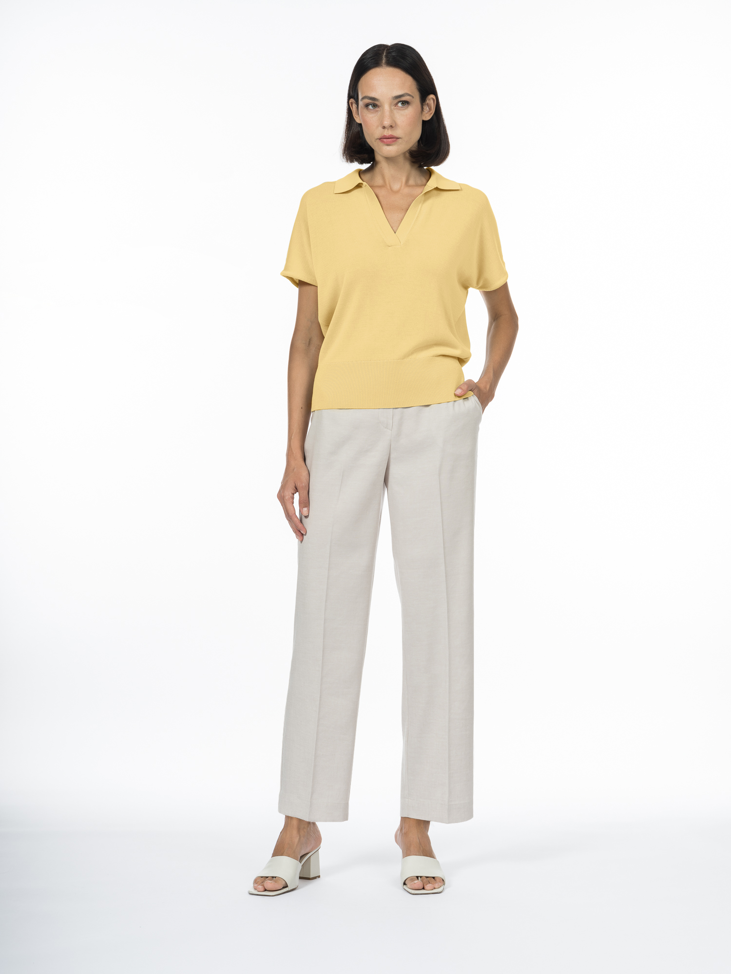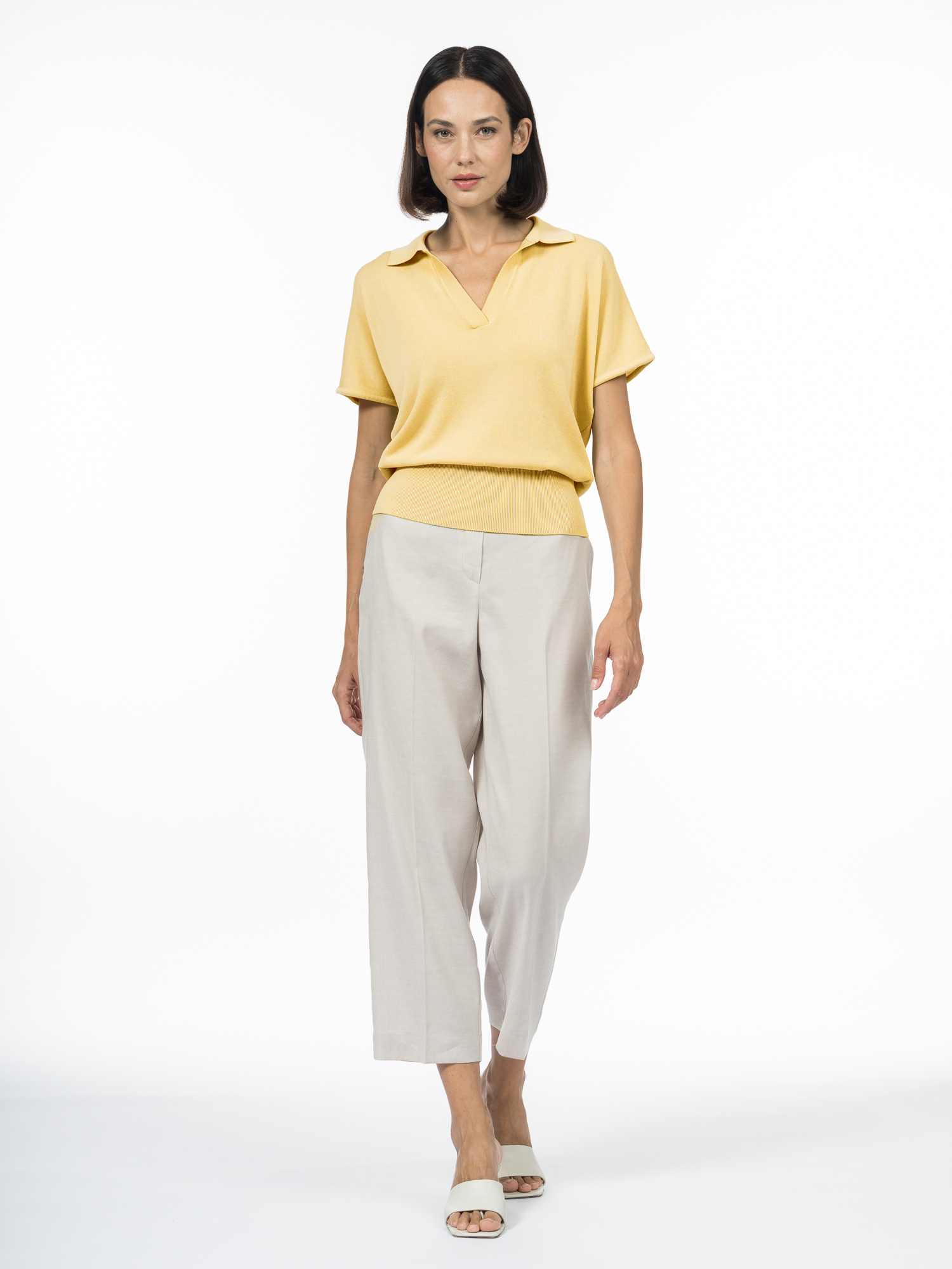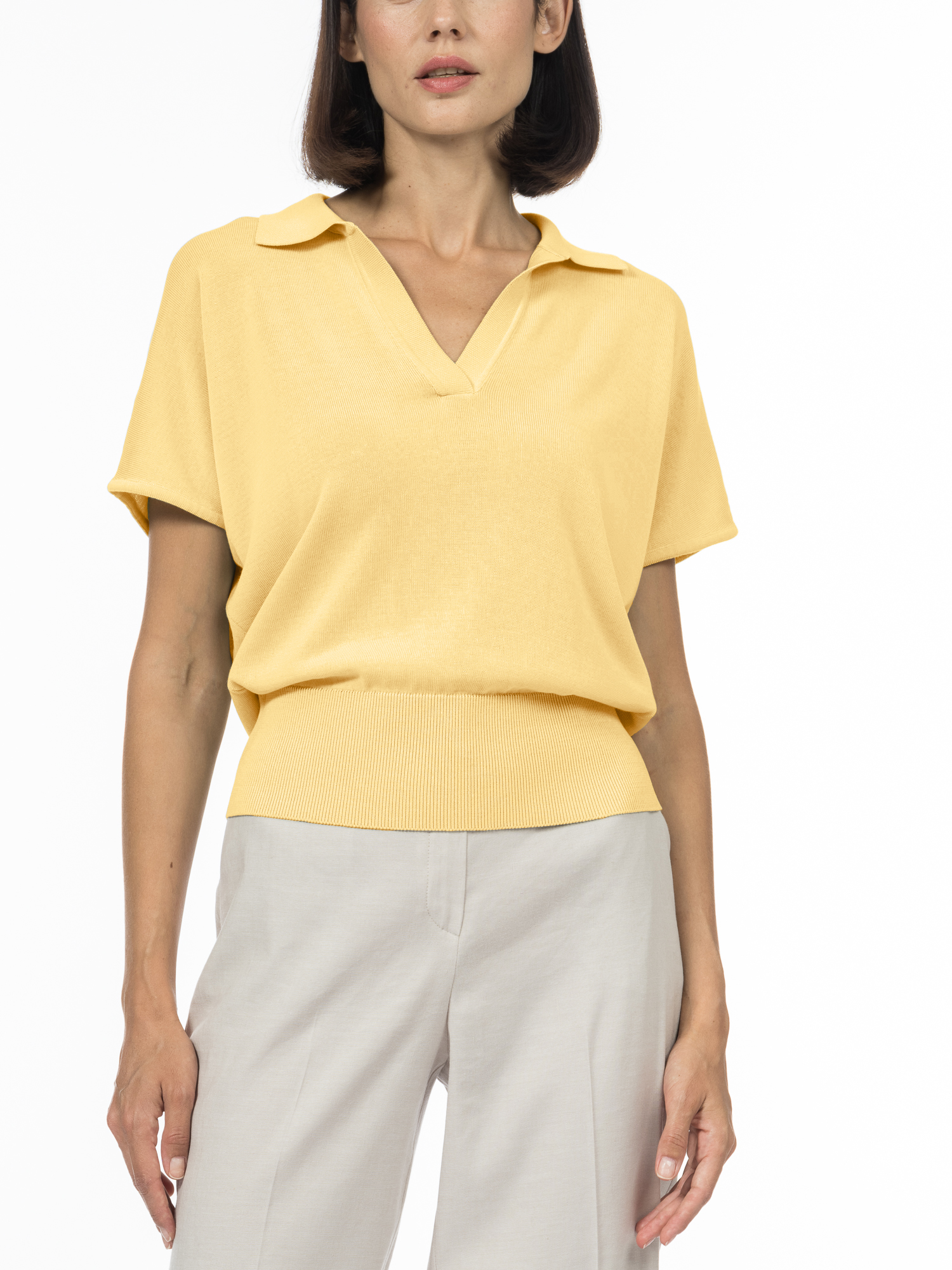 Нежно-желтый, солнечный оттенок пряжи ассоциируется с уютом и дарит позитивное настроение, поло станет ярким акцентом гардероба, особенно в сочетании с моделями базовых цветов.