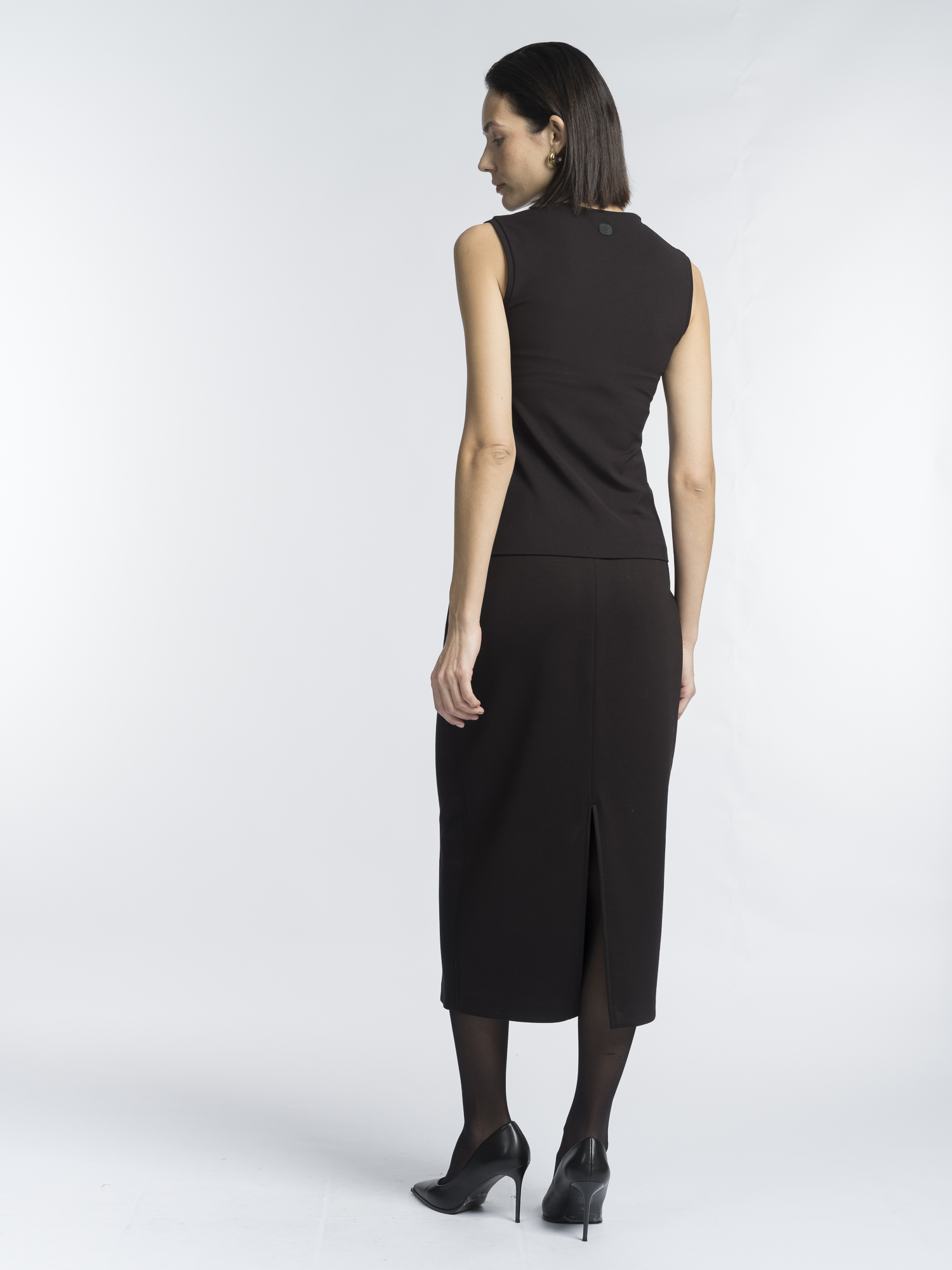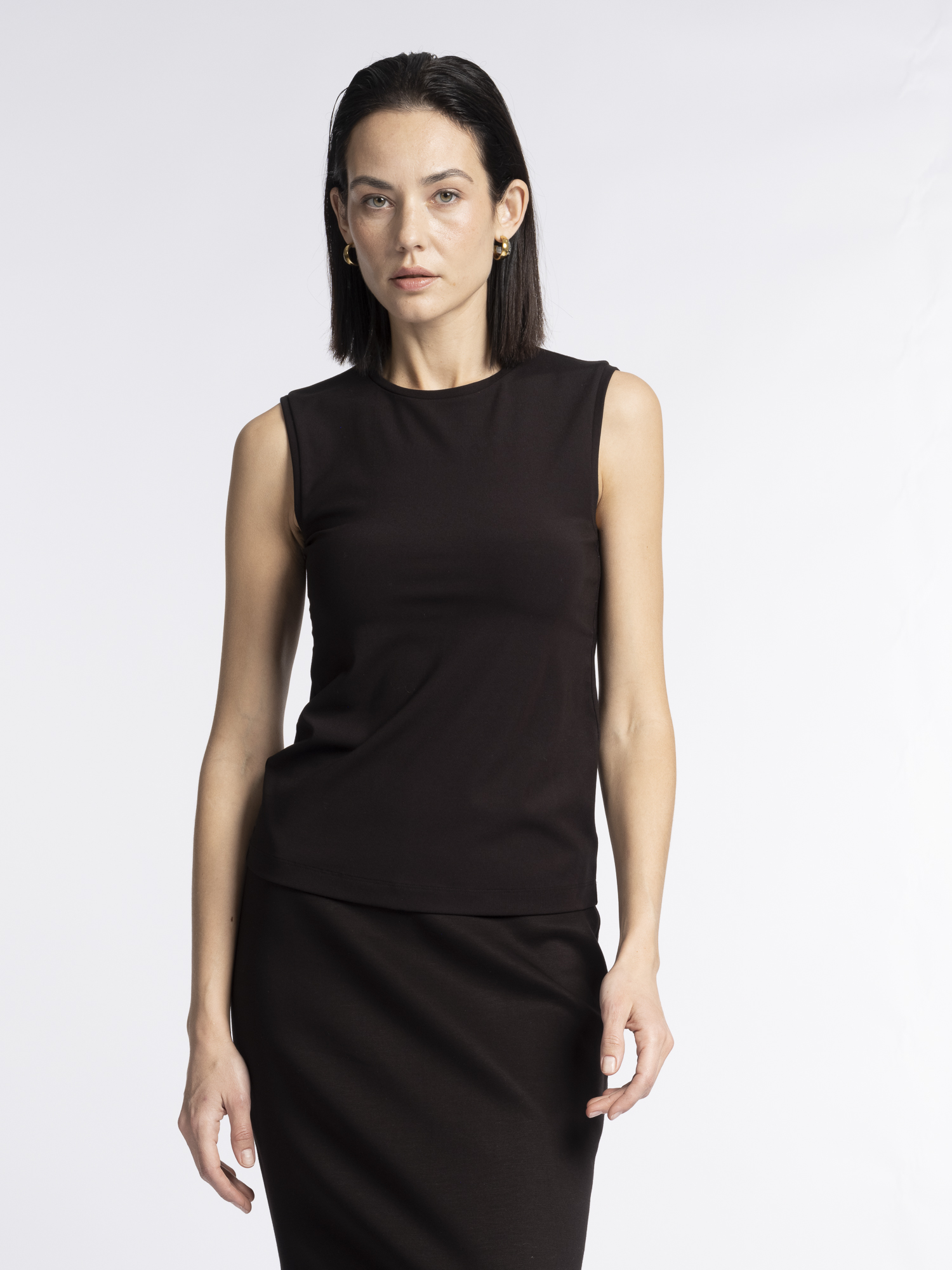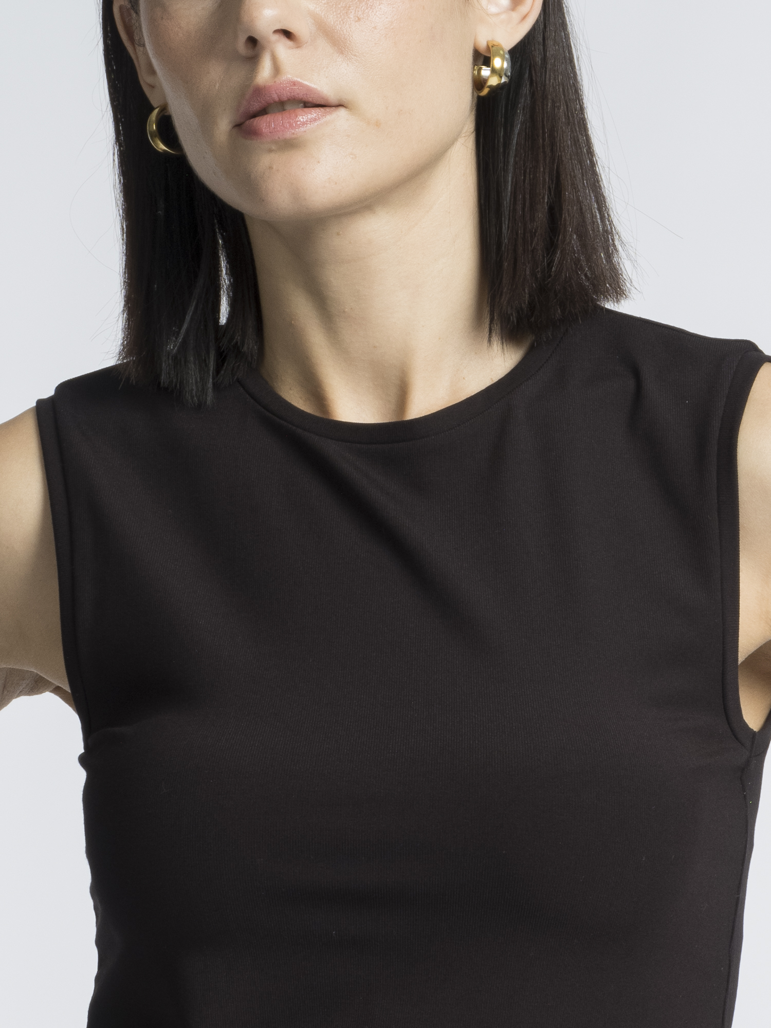 Базовый топ - незаменимая вещь для каждого сезона. Модель с круглым вырезом, без рукава, комфортного облегания, длиной до середины бедра, дополнена брендированным силиконовым патчем.Выбрали для топа фактурный вискозный трикотаж "рибана". Такое полотно тактильно приятно, эластично, долговечно и формоустойчиво.