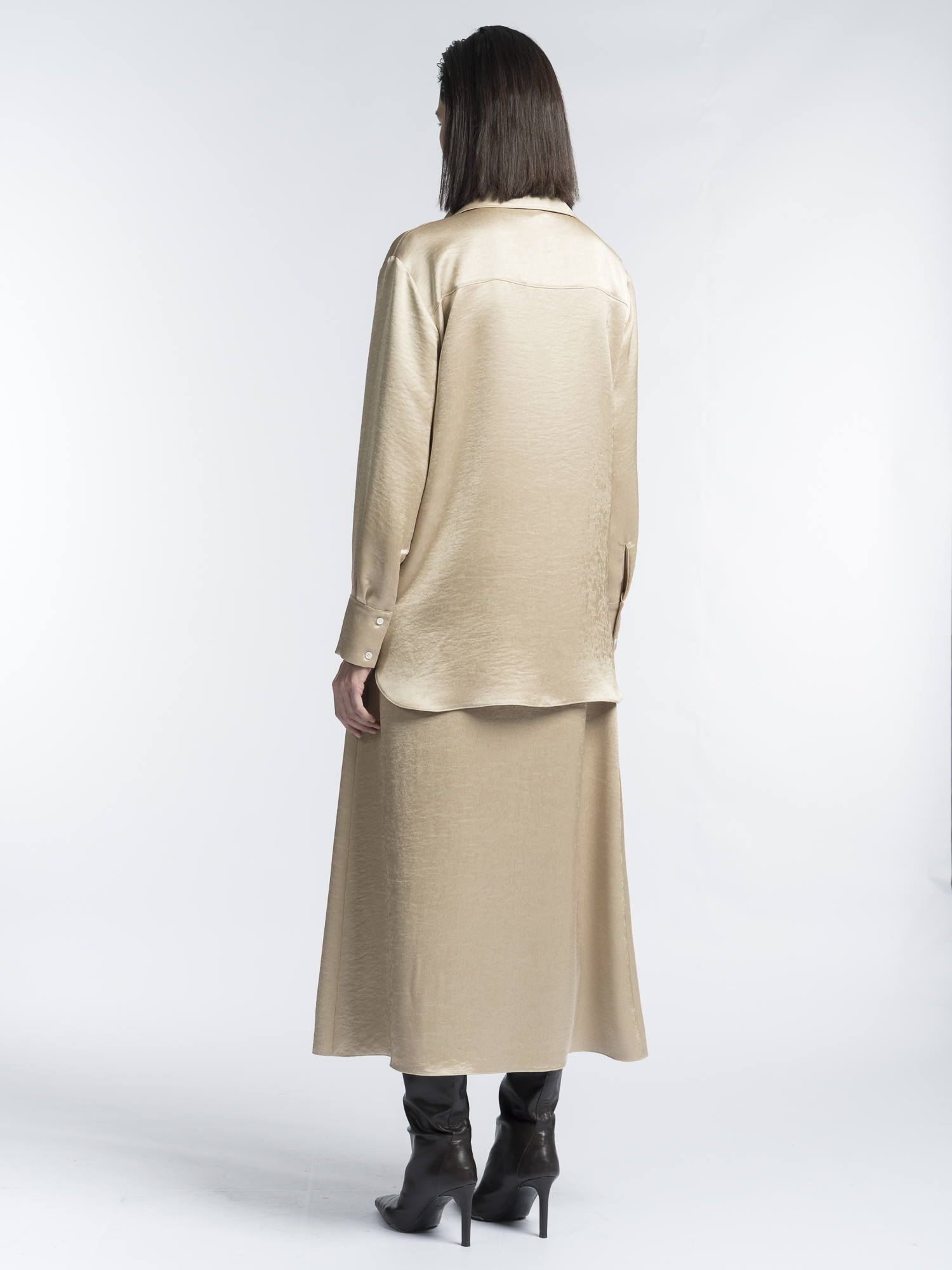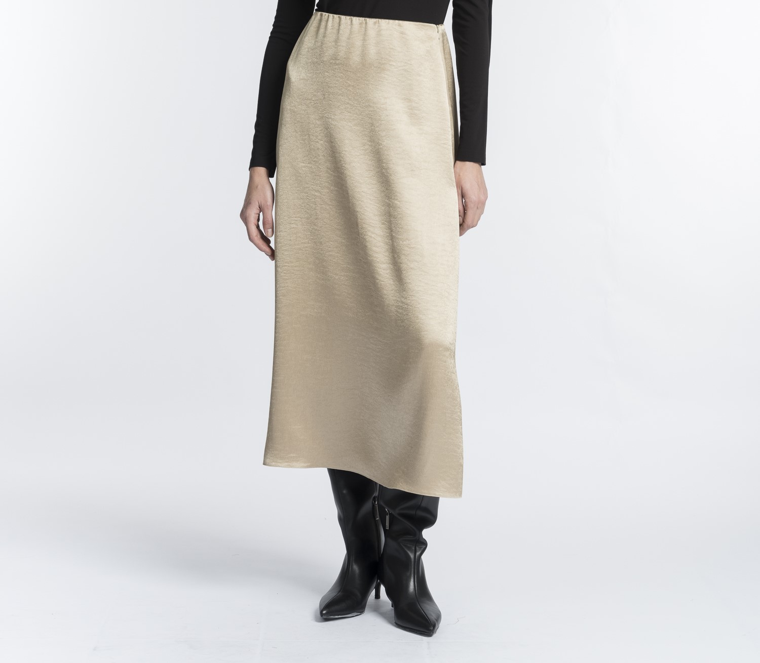 Юбка трапециевидного А-силуэта. Модель без притачного пояса с застежкой на потайную молнию и со скрытой резинкой по талии демонстрирует прекрасную посадку по бедрам.Выбрали для модели высокотехнологичный полиэстер с благородным золотым отливом и эффектом крэш. Такая жатая ткань не мнется, сохраняя форму весь день и не требуя особого ухода. Светло-бежевый с золотистым подтоном комплементарен к темным, светлым и ярким оттенкам.