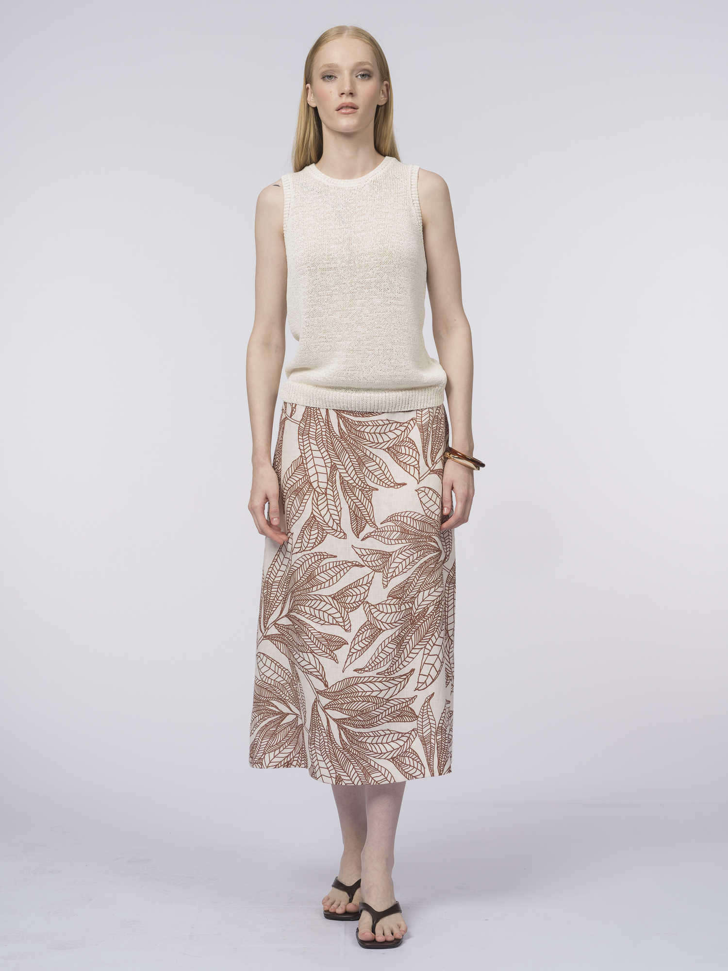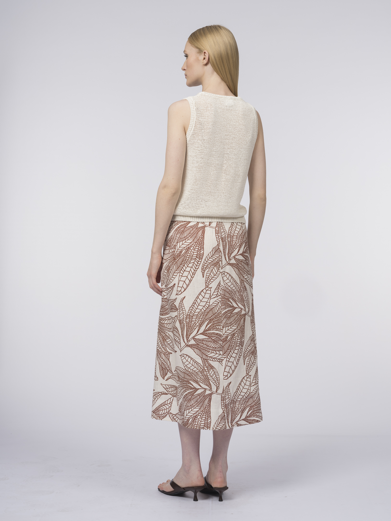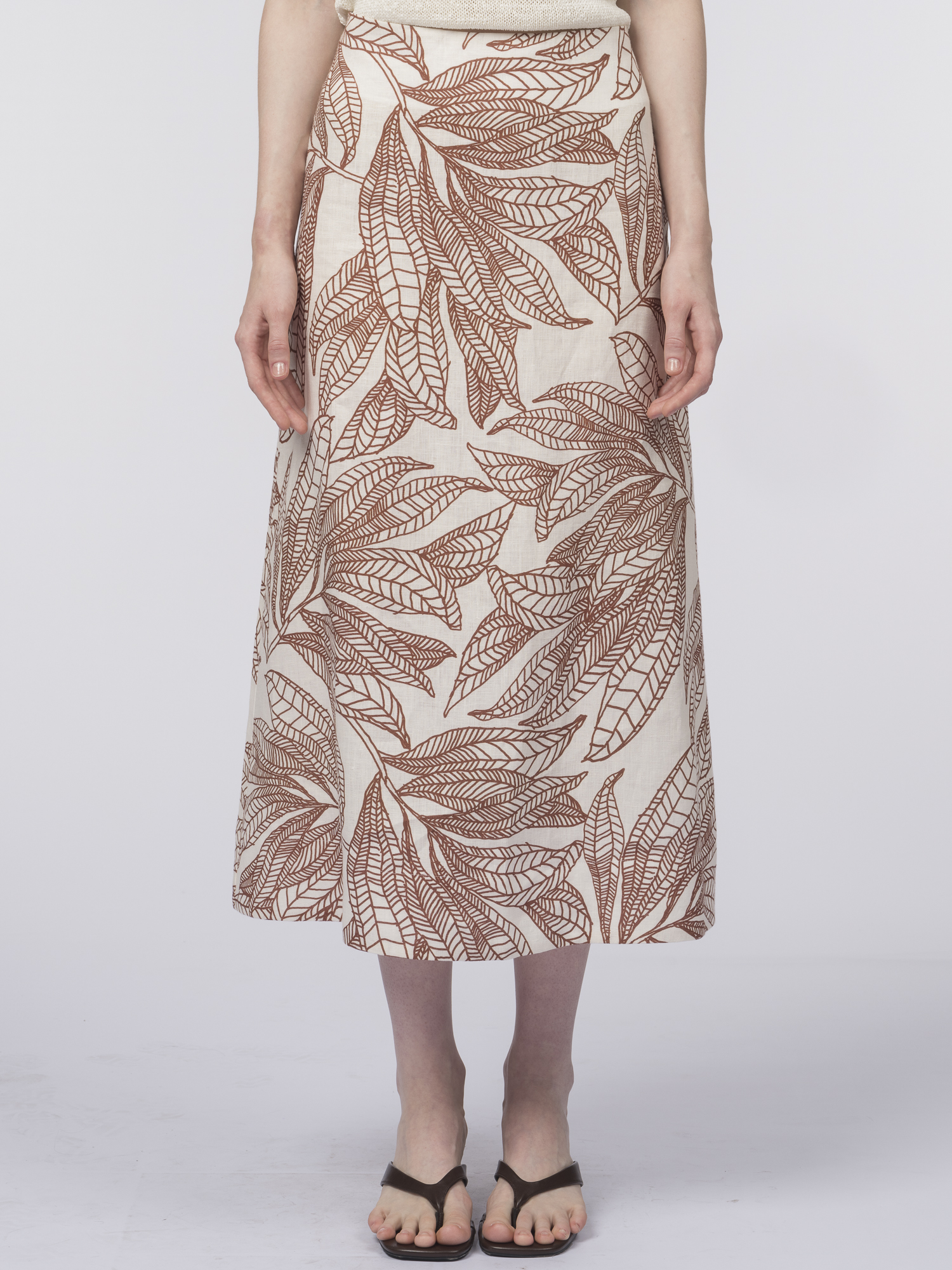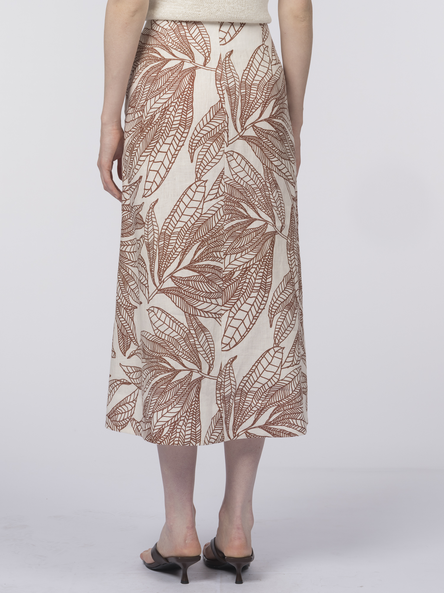 Летняя юбка с легким расклешением – воплощение женственности и легкости. Сшитая из 100% льна, юбка прекрасно пропускает воздух и поддерживает комфортную температуру тела.Юбка выполнена без притачного пояса для максимального комфорта, а потайная молния обеспечивает аккуратную посадку. Главное украшение – ткань с художественным терракотовым принтом на нежно-бережном фоне: графичные силуэты листьев выглядят стильно и современно.