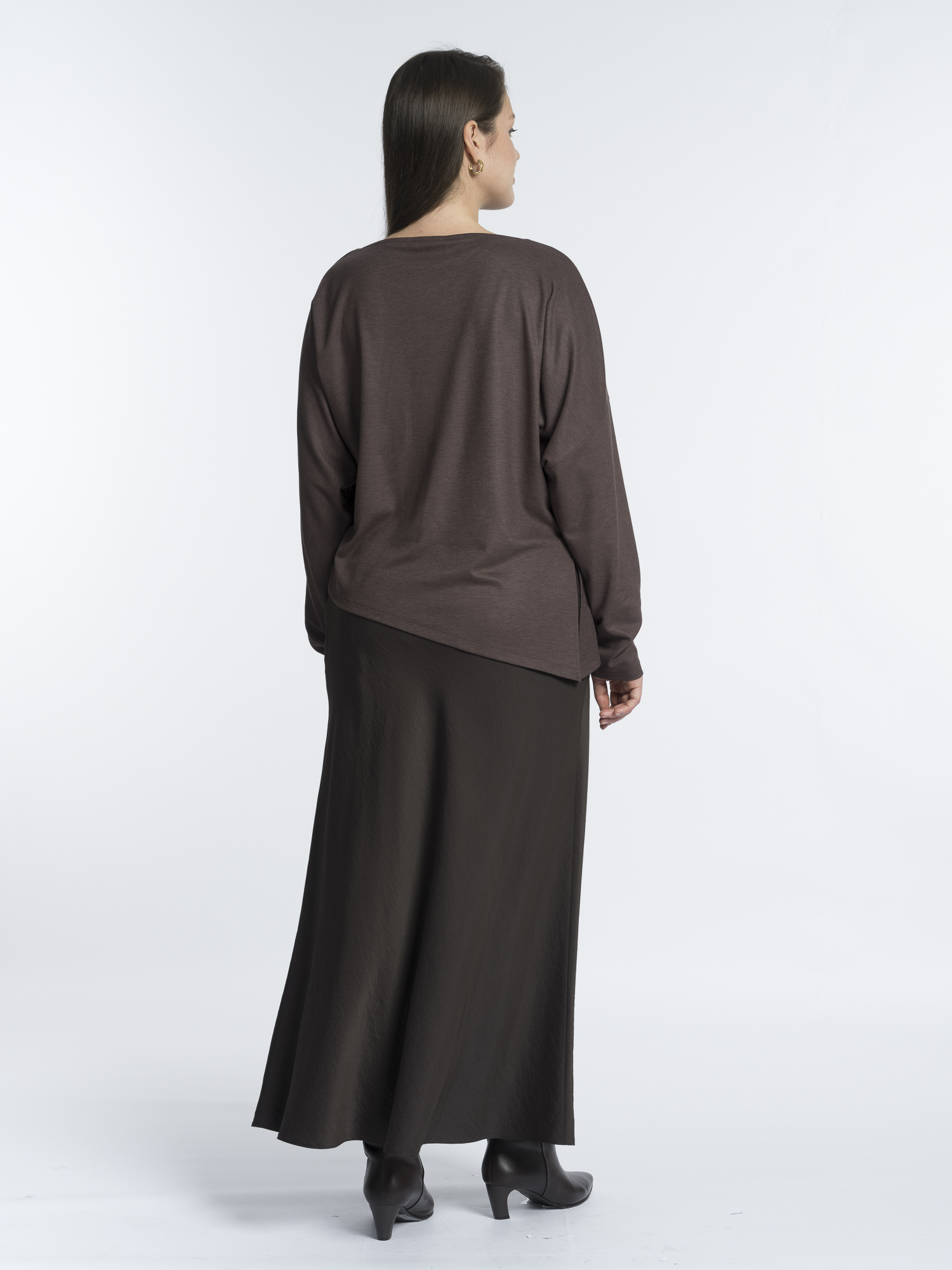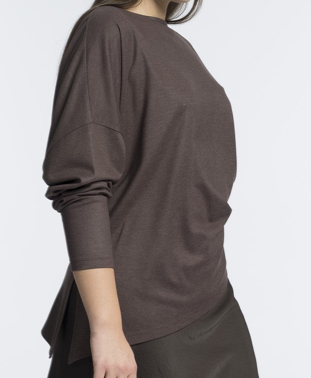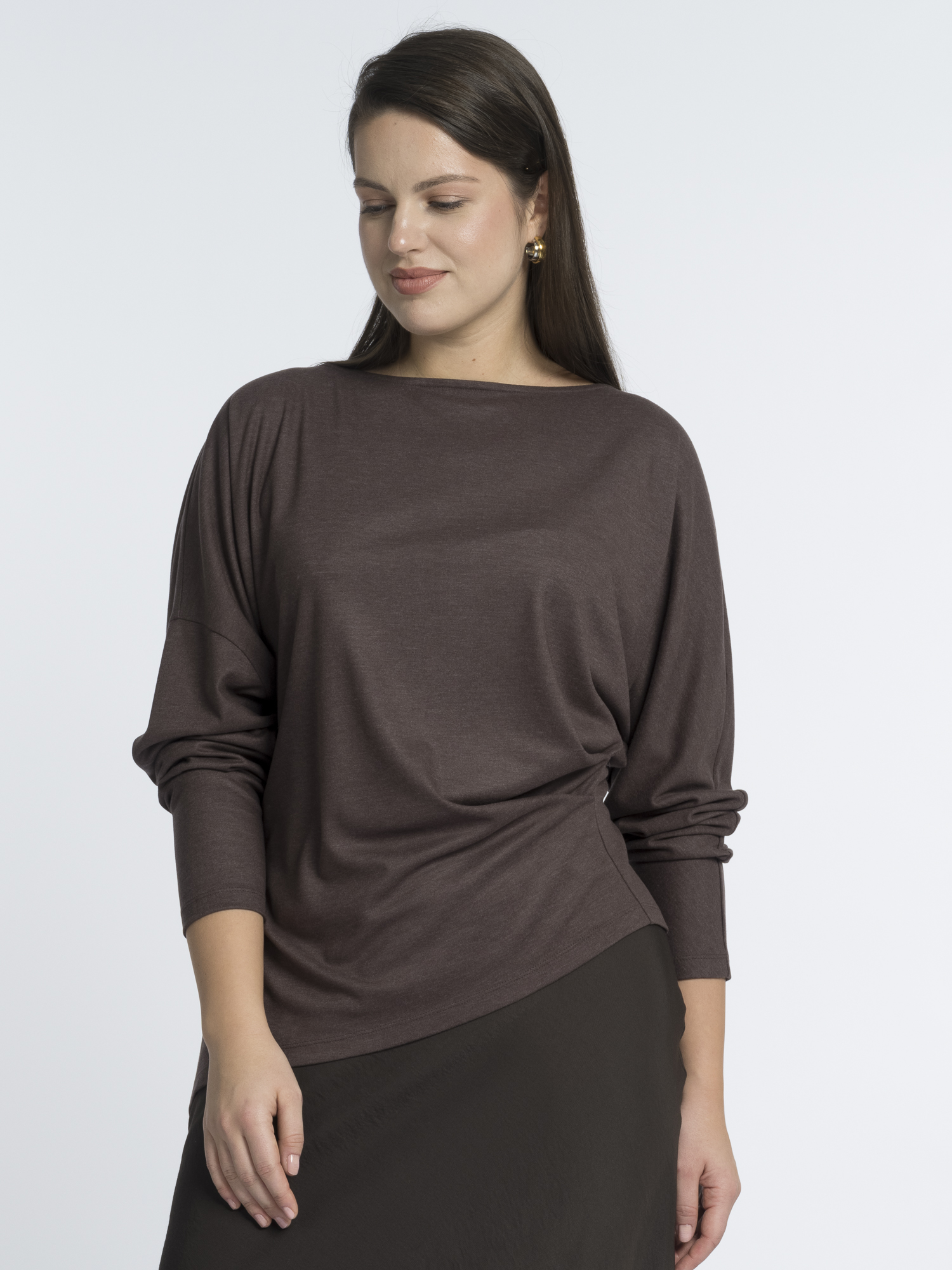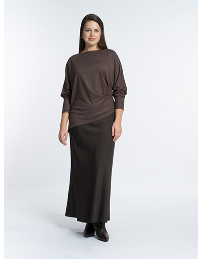 Блузка с асимметричным вырезом — воплощение художественной смелости и утонченного комфорта. Меланжевый трикотаж с фланелевым эффектом в благородном кофейном оттенке — это гимн тактильному удовольствию. Ткань вискозы, полиэстера, овечьей шерсти и спандекса сочетает в себе лучшее: нежность вискозы, прочность полиэстера, природное тепло шерсти и идеальную эластичность. Этот состав дарит коже ощущение комфорта весь день.Лодочка мягко обрамляет линию плеч, добавляя образу современную изысканность, в то время как игра контрастов — цельнокроеный левый рукав и втачной правый — превращает каждое движение в элемент перформанса. Складки по левому боковому шву создают объем и динамику, а разрез по правому с асимметрией добавляет ноту дерзости, делая модель настоящим произведением искусства.