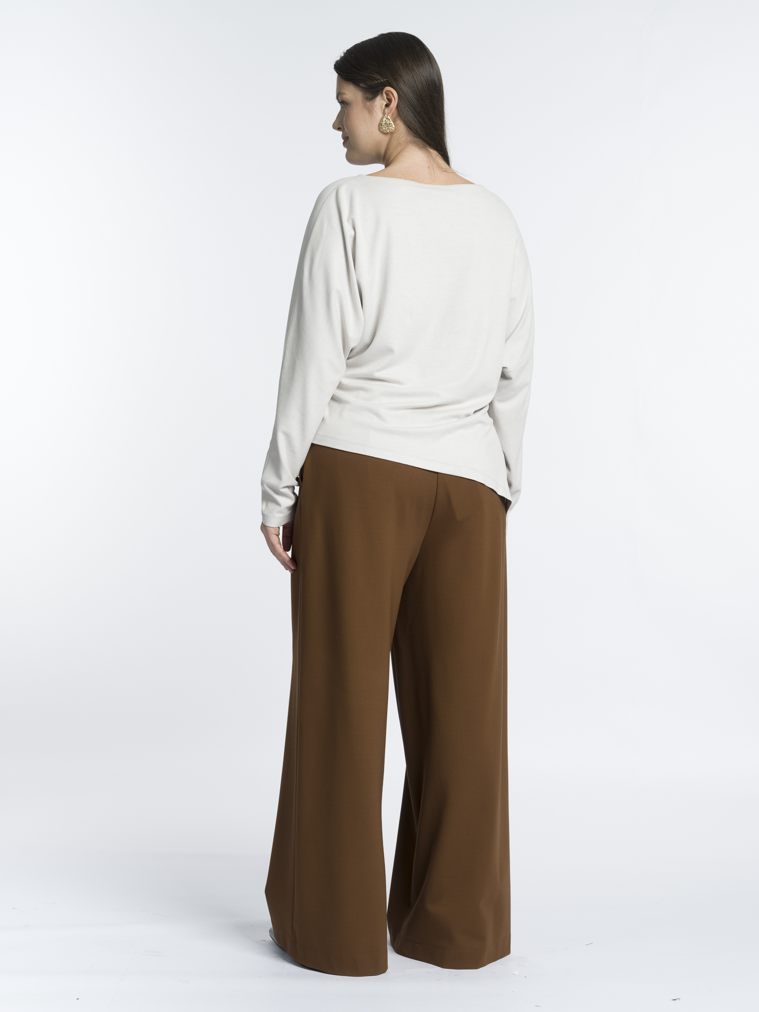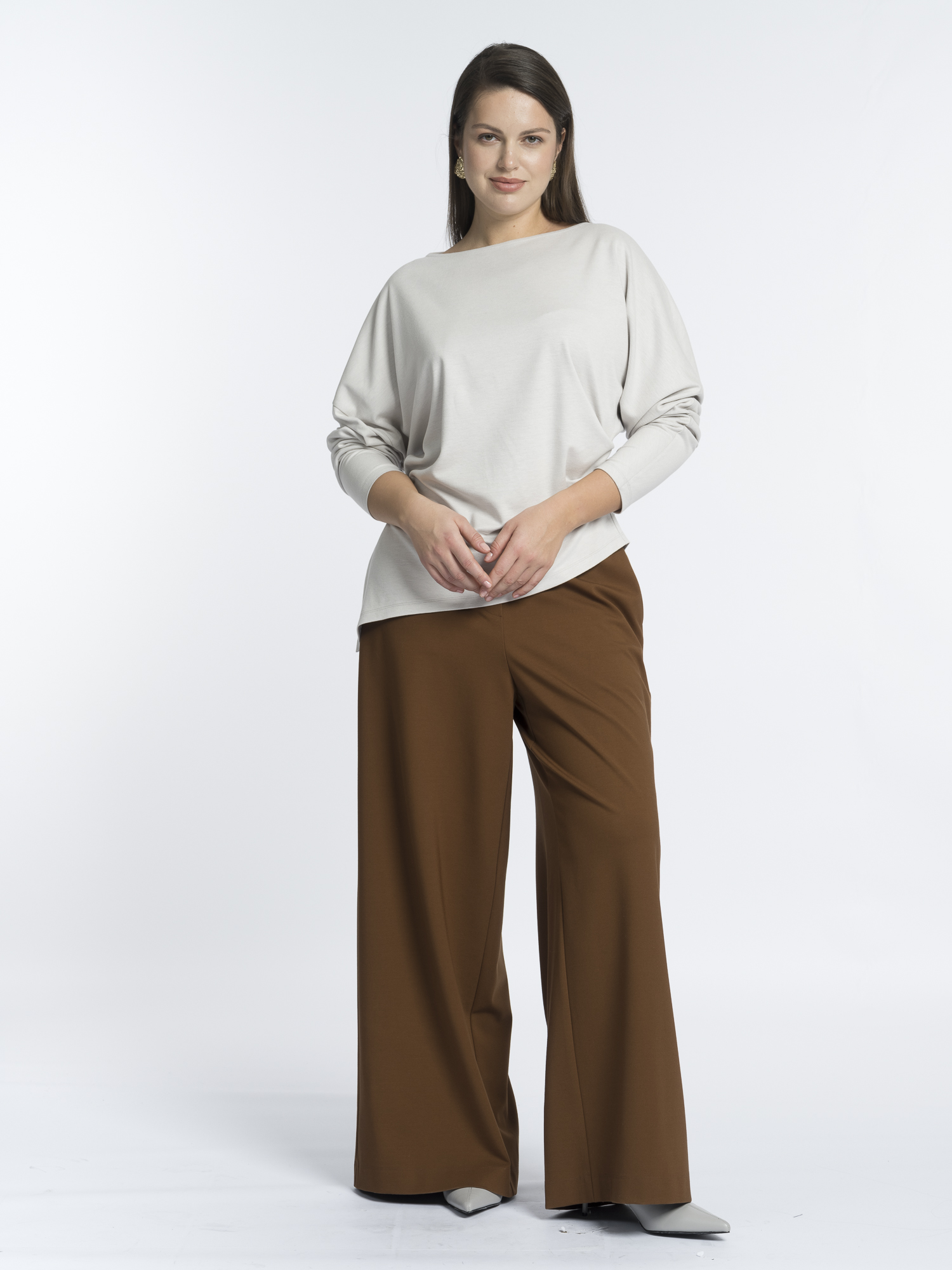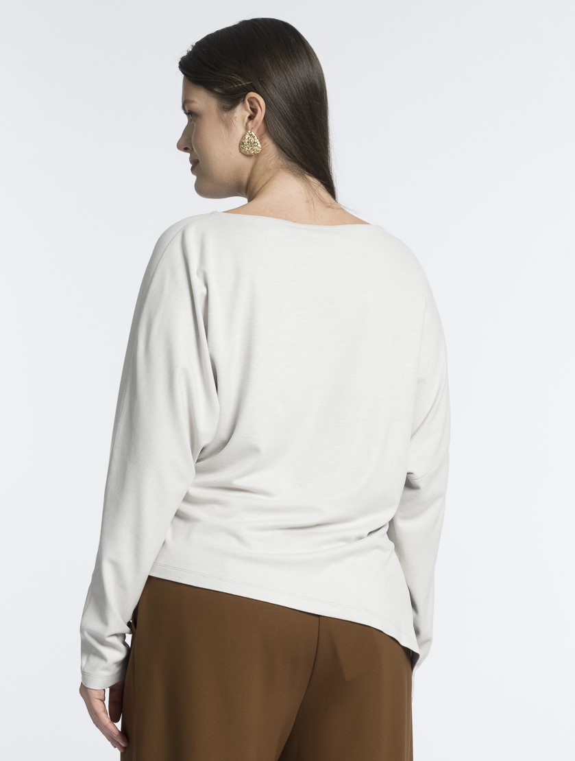 Блузка с асимметричным вырезом — воплощение художественной смелости и утонченного комфорта. Меланжевый трикотаж с фланелевым эффектом в уникальном серо-молочном оттенке "французский дуб" — это гимн тактильному удовольствию. Ткань вискозы, полиэстера, овечьей шерсти и спандекса сочетает в себе лучшее: нежность вискозы, прочность полиэстера, природное тепло шерсти и идеальную эластичность. Этот состав дарит коже ощущение комфорта весь день.Лодочка мягко обрамляет линию плеч, добавляя образу современную изысканность, в то время как игра контрастов — цельнокроеный левый рукав и втачной правый — превращает каждое движение в элемент перформанса. Складки по левому боковому шву создают объем и динамику, а разрез по правому с асимметрией добавляет ноту дерзости, делая модель настоящим произведением искусства.