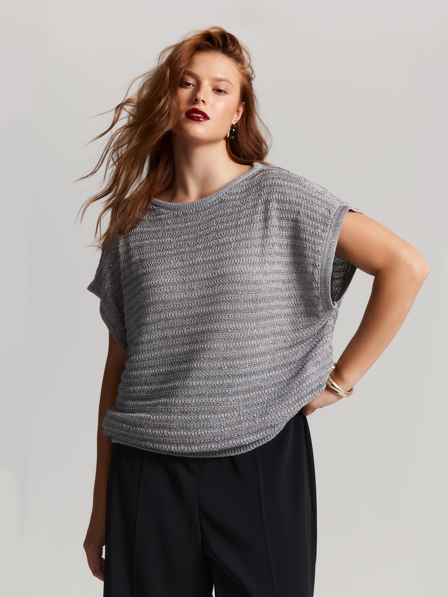 Серебристо-серый цвет с мерцающими пайетками добавляет образу универсальности. Такой джемпер подойдет для разных ситуаций: от офиса и встреч до вечеринок.