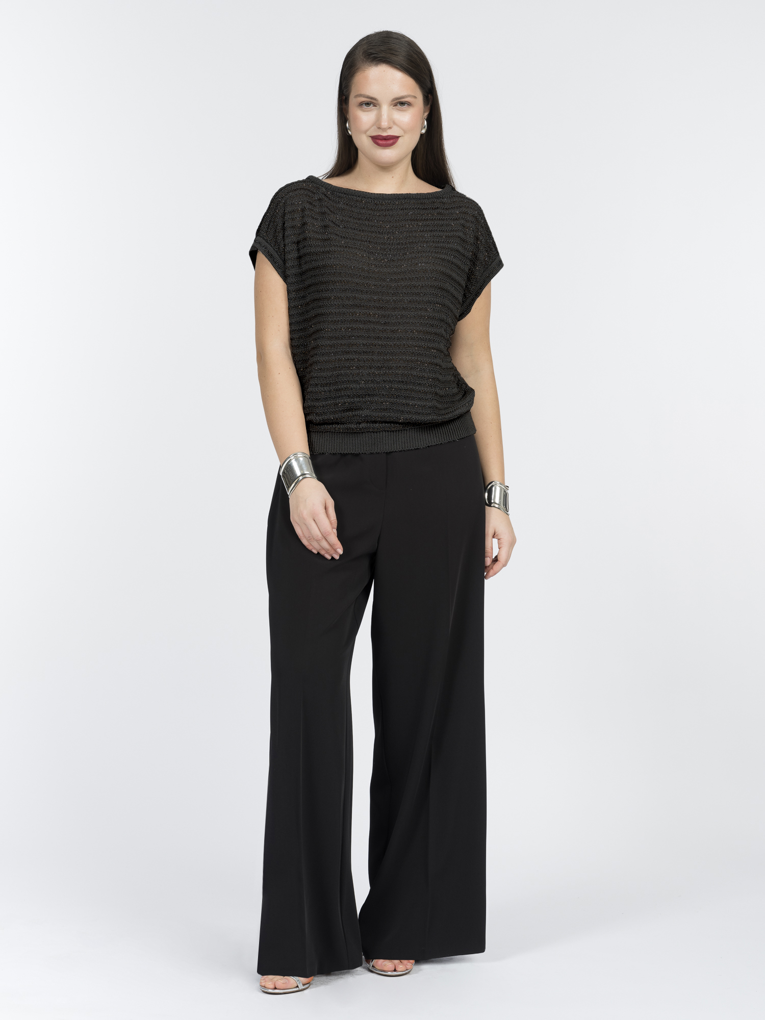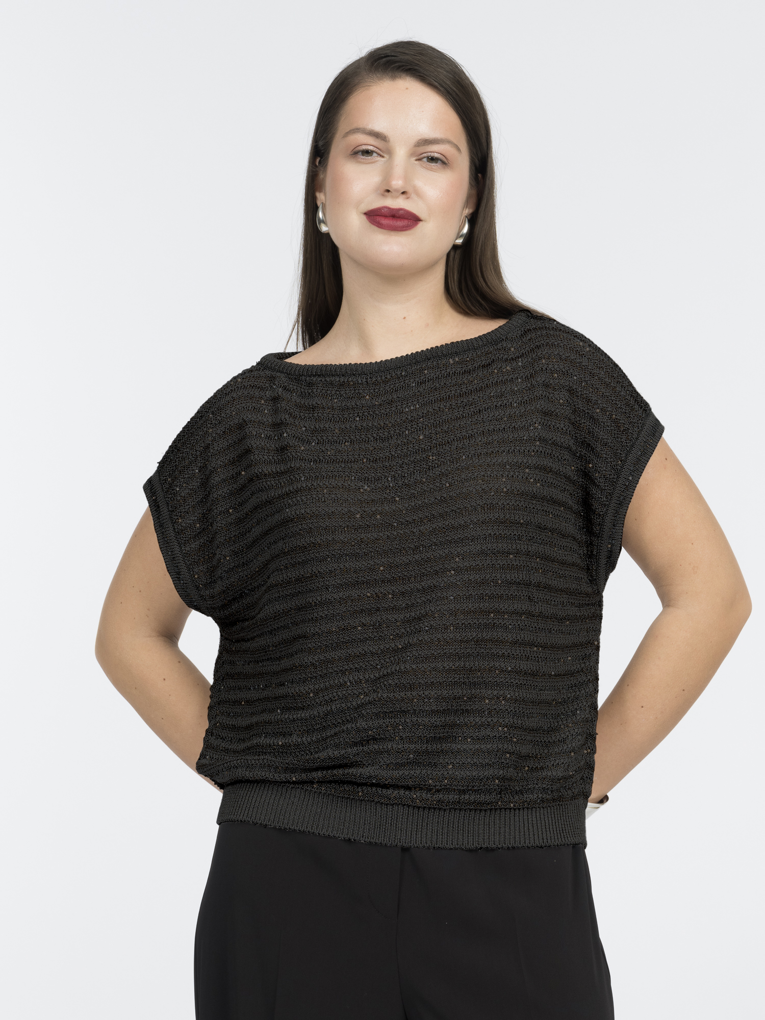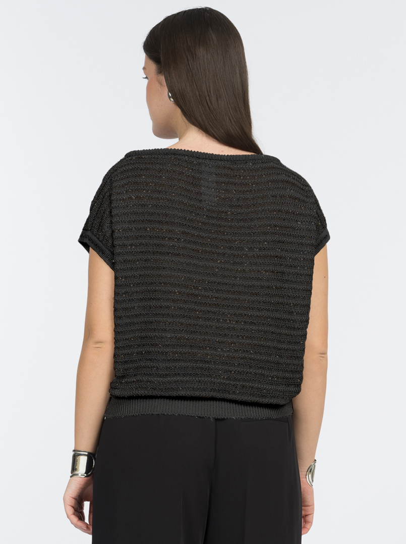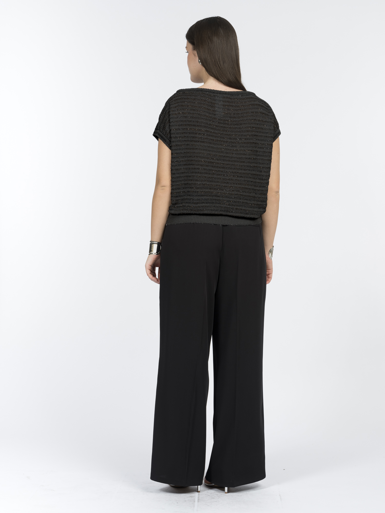 Классический черный цвет с мерцающими пайетками добавляет образу универсальности. Такой джемпер подойдет для разных ситуаций: от офиса и встреч до вечеринок.