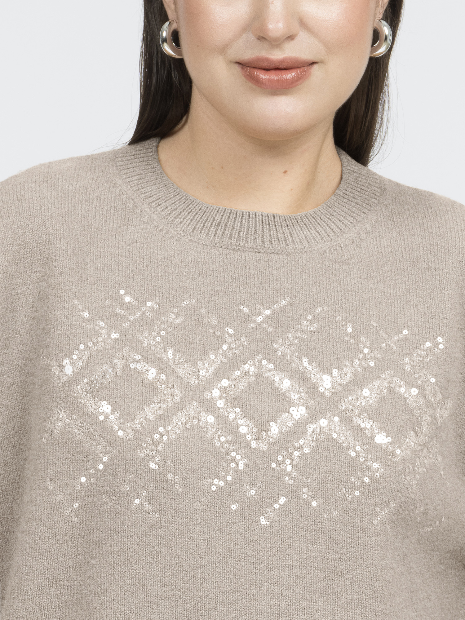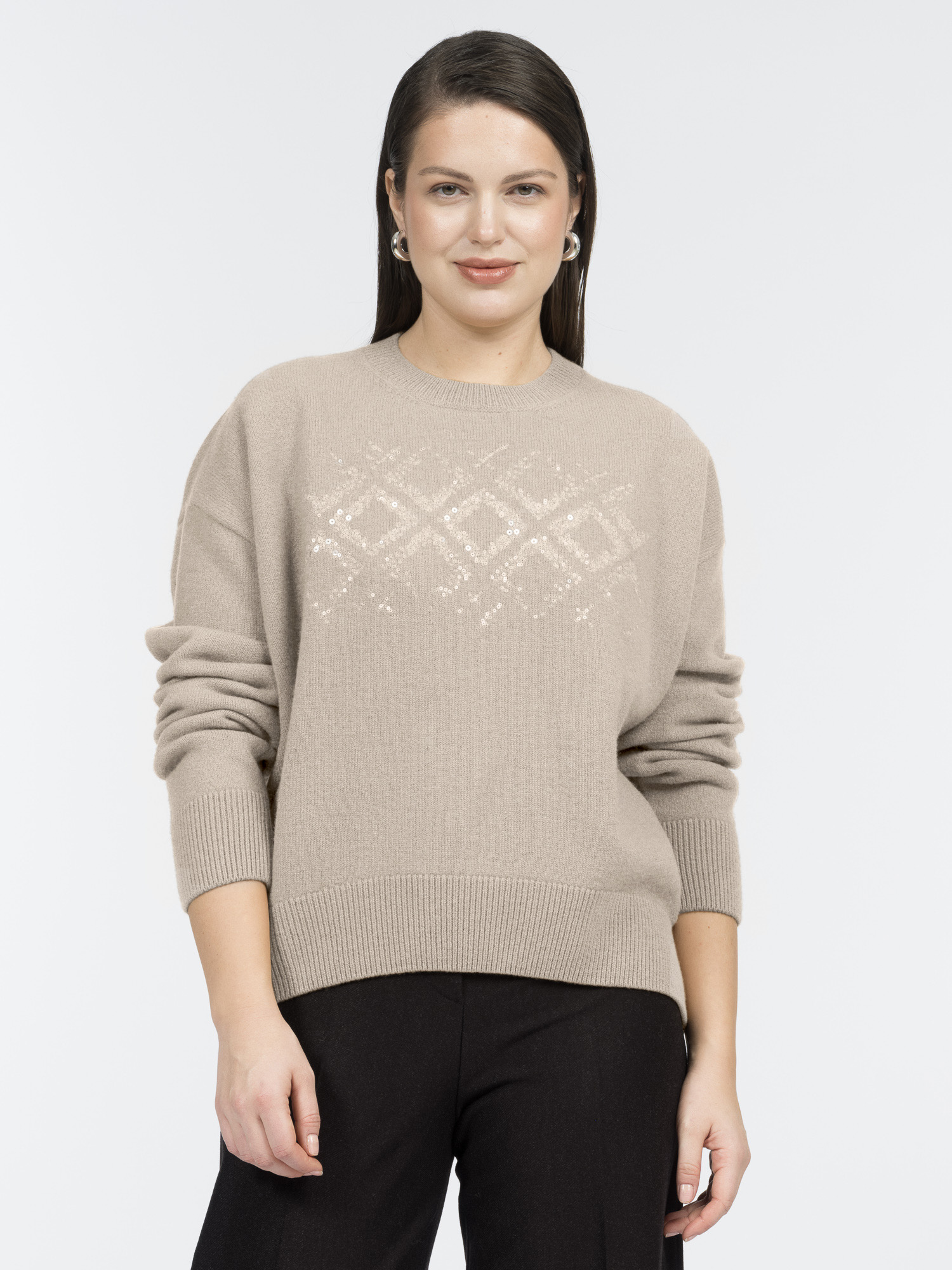 Джемпер связан из мягкой шерсти мериноса. Он отлично сохраняет тепло, позволяет коже дышать и совсем не колется. Модель с круглым вырезом и спущенным плечом сидит удобно, а резинки по горловине, манжетам и низу мягко фиксируют форму.Натуральная пряжа создает уникальную текстуру, а особая вышивка пайетками добавляет изюминку, как бы растворяясь в вязаном полотне. Использование высокоточного оборудования гарантирует качество исполнения, а особые эластичные швы делают джемпер невероятно комфортным и уютным.