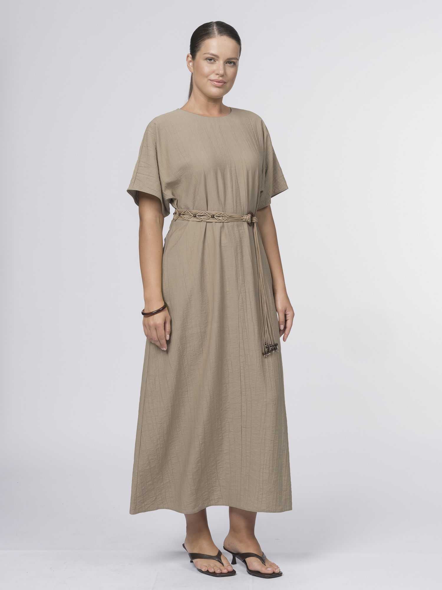 Платье из мягкой вискозы с добавлением полиамида приятно облегает фигуру и демонстрирует легкое расклешение книзу. Цельнокроеный рукав и аккуратная горловина с обтачкой делают силуэт женственным, а потайная молния на спинке обеспечивает удобную посадку.Удобные боковые карманы и пояс-макраме в комплекте добавляют практичности и помогают подчеркнуть талию. Ткань струится по телу и позволяет коже дышать.