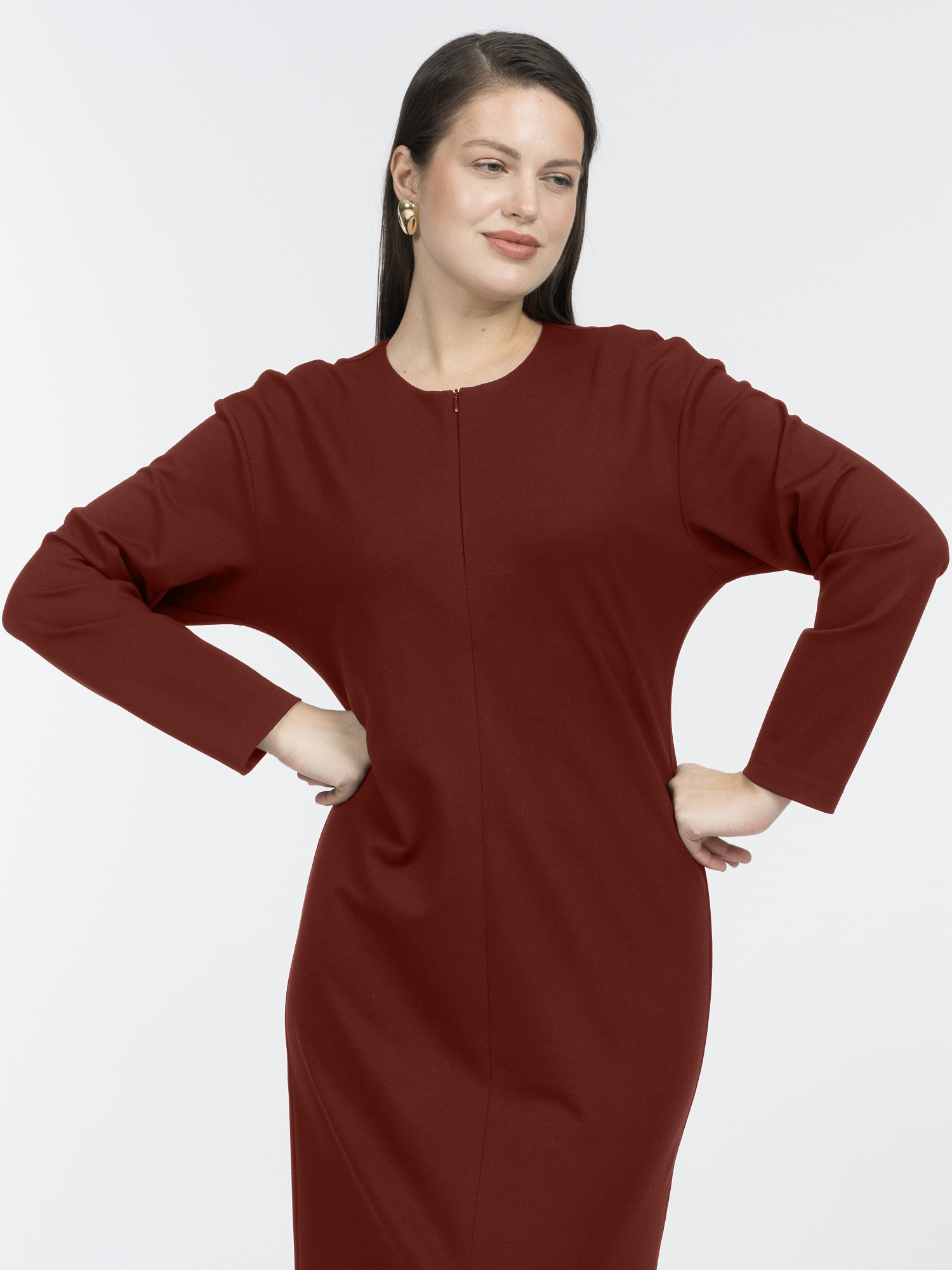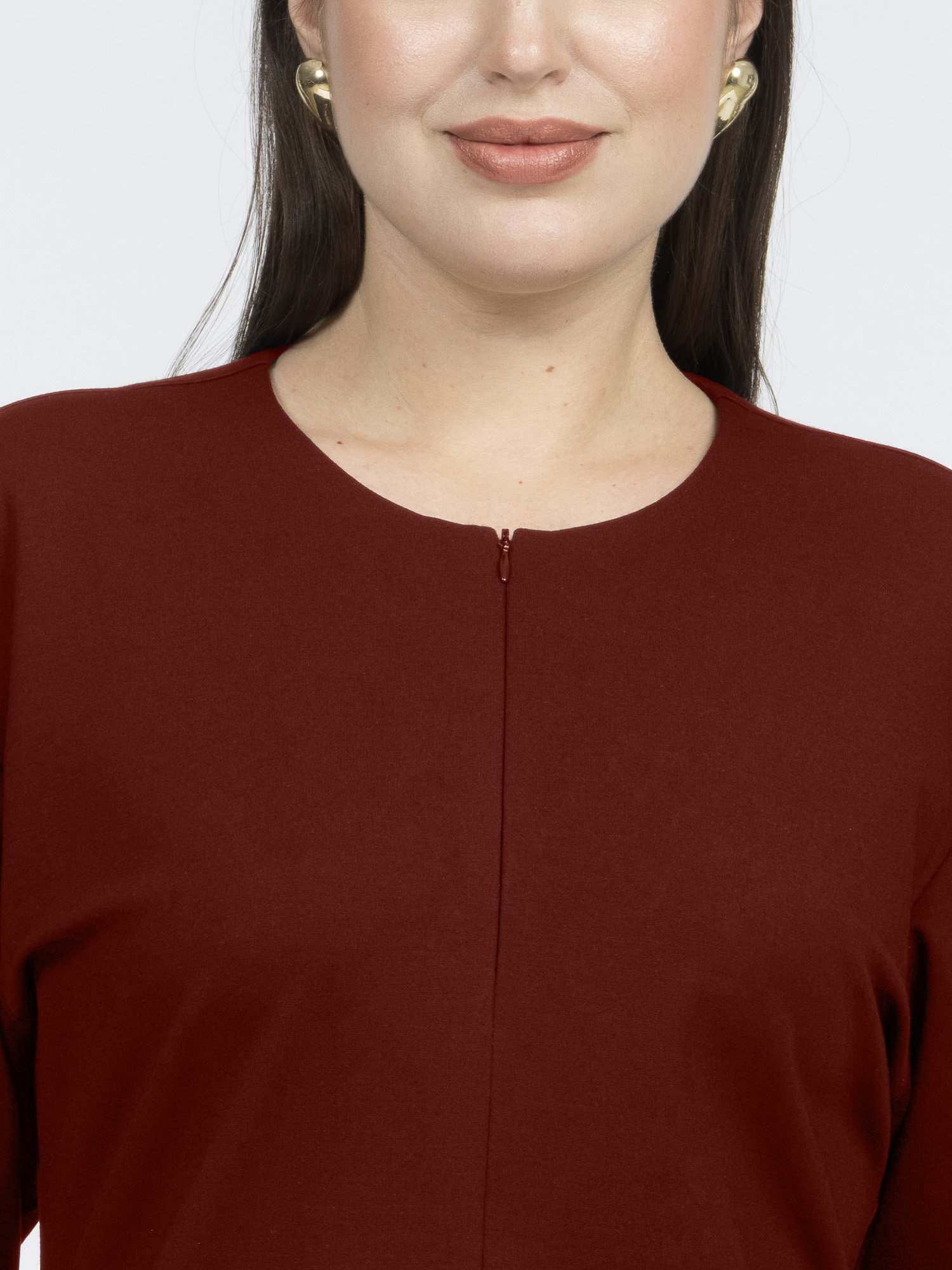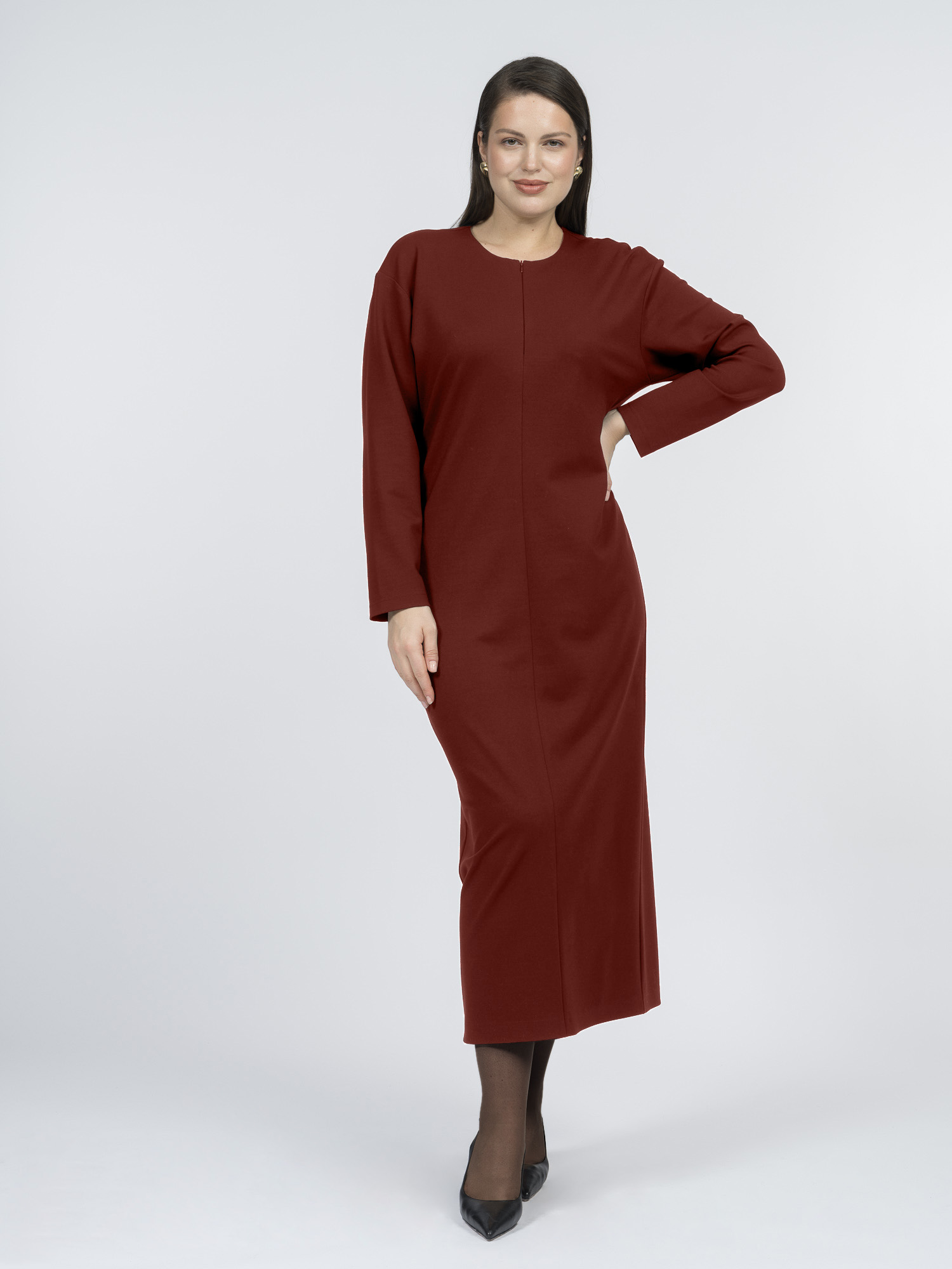 Насыщенный винный цвет добавляет образу элегантности. Такое платье можно носить с обувью на каблуке или балетками для работы и встреч.
